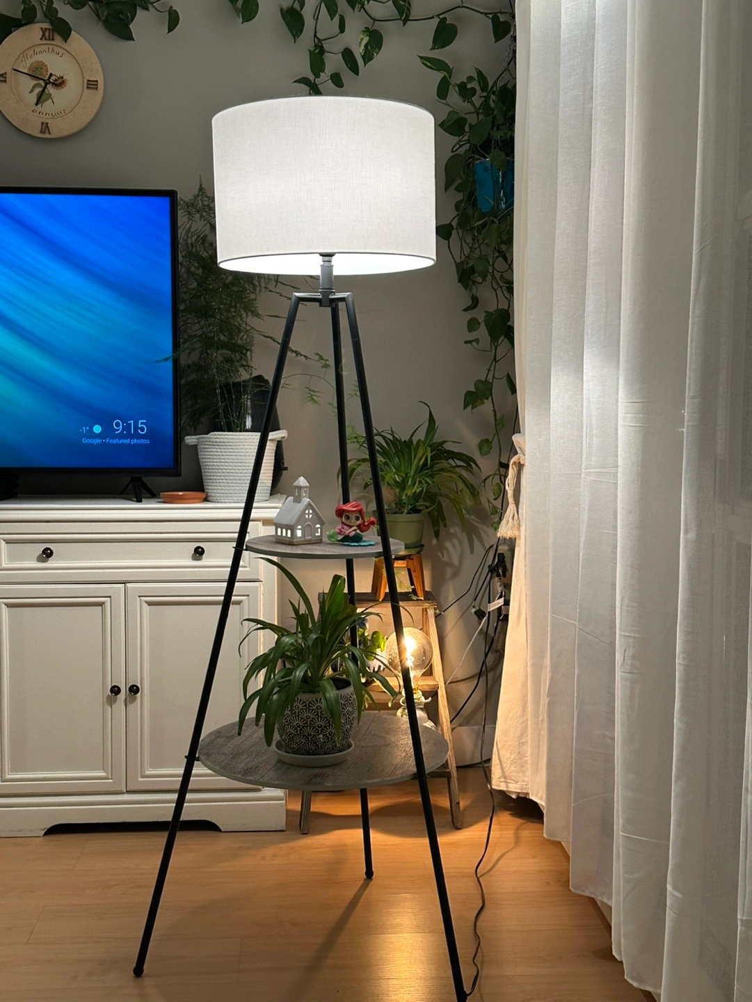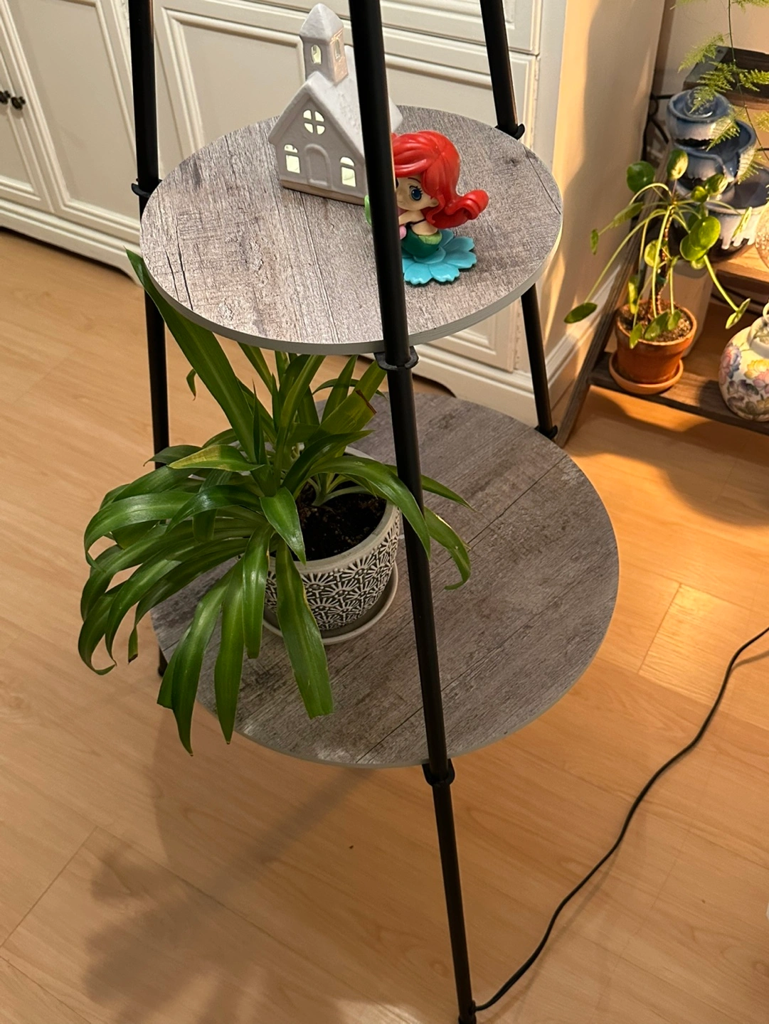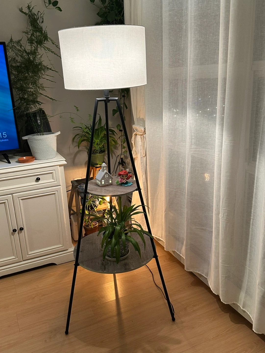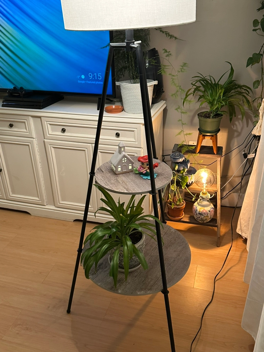 Stylish tripod floor lamp. Features three circular shelves. Great for plants, decor, or books. Black metal frame, wood-look shelves. Light colour is warm white. Excellent condition paid 200 $ Price is final ⛔️ Lamp shade in not including extra ⛔️