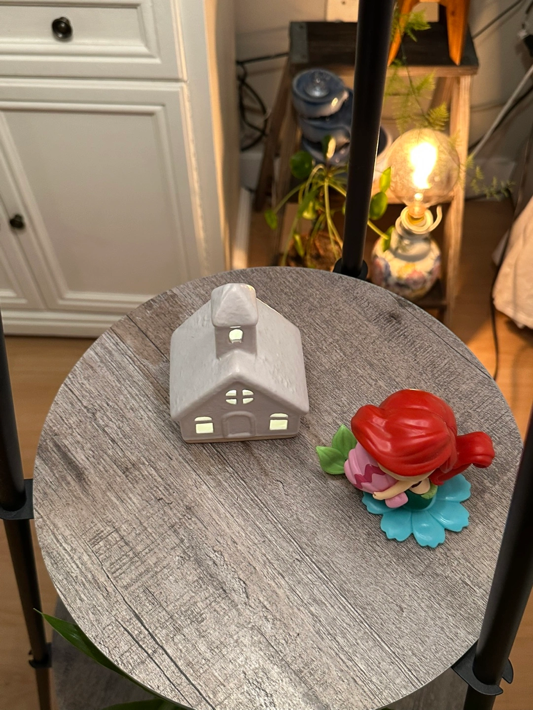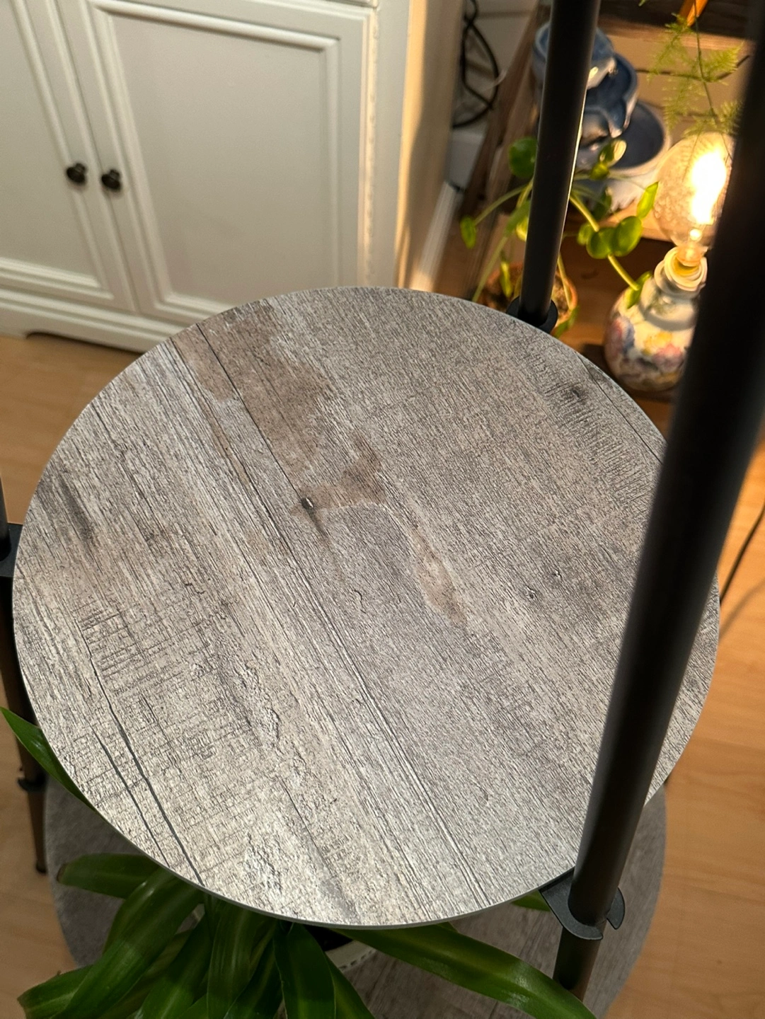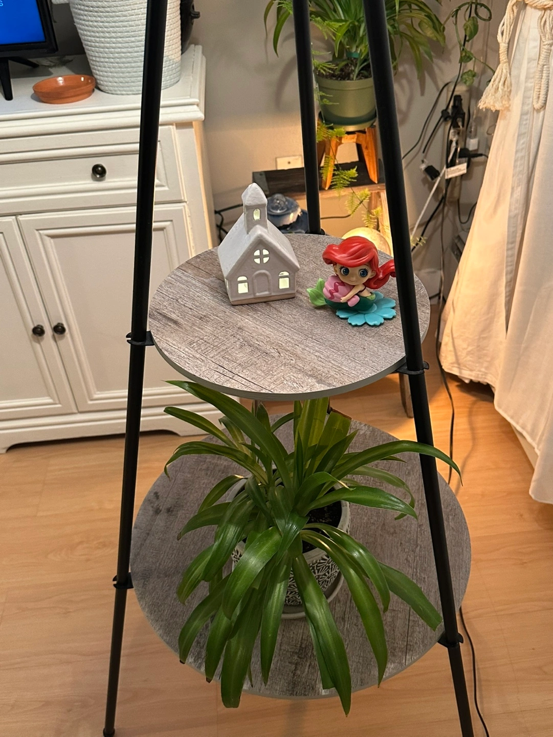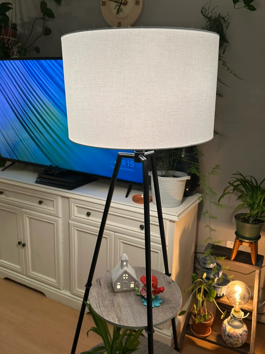 Stylish tripod floor lamp. Features three circular shelves. Great for plants, decor, or books. Black metal frame, wood-look shelves. Light colour is warm white. Excellent condition paid 200 $ Price is final ⛔️ Lamp shade in not including extra ⛔️