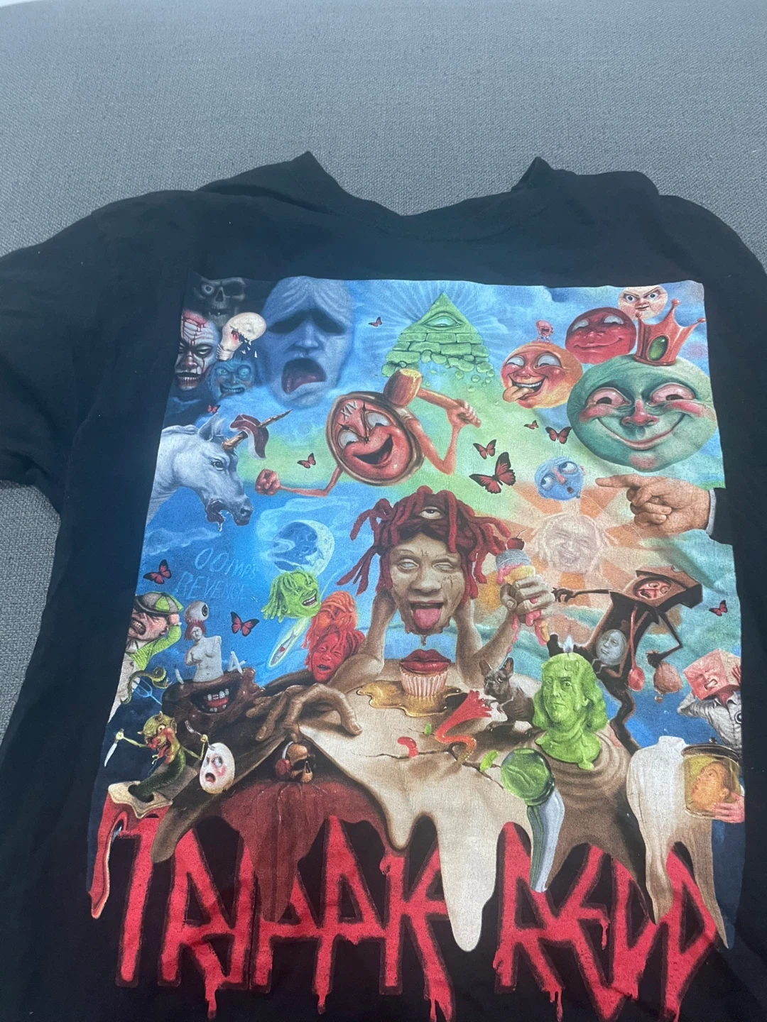 Selling a Trippie Redd T-shirt in size medium. The shirt is made of 100% cotton and manufactured in Honduras. It features a colourful graphic print