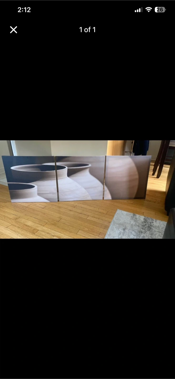 Selling a triptych canvas wall art set. The design features a pottery theme and would look great in any home. It's in great condition and ready to find a new home! PICK UP ONLY