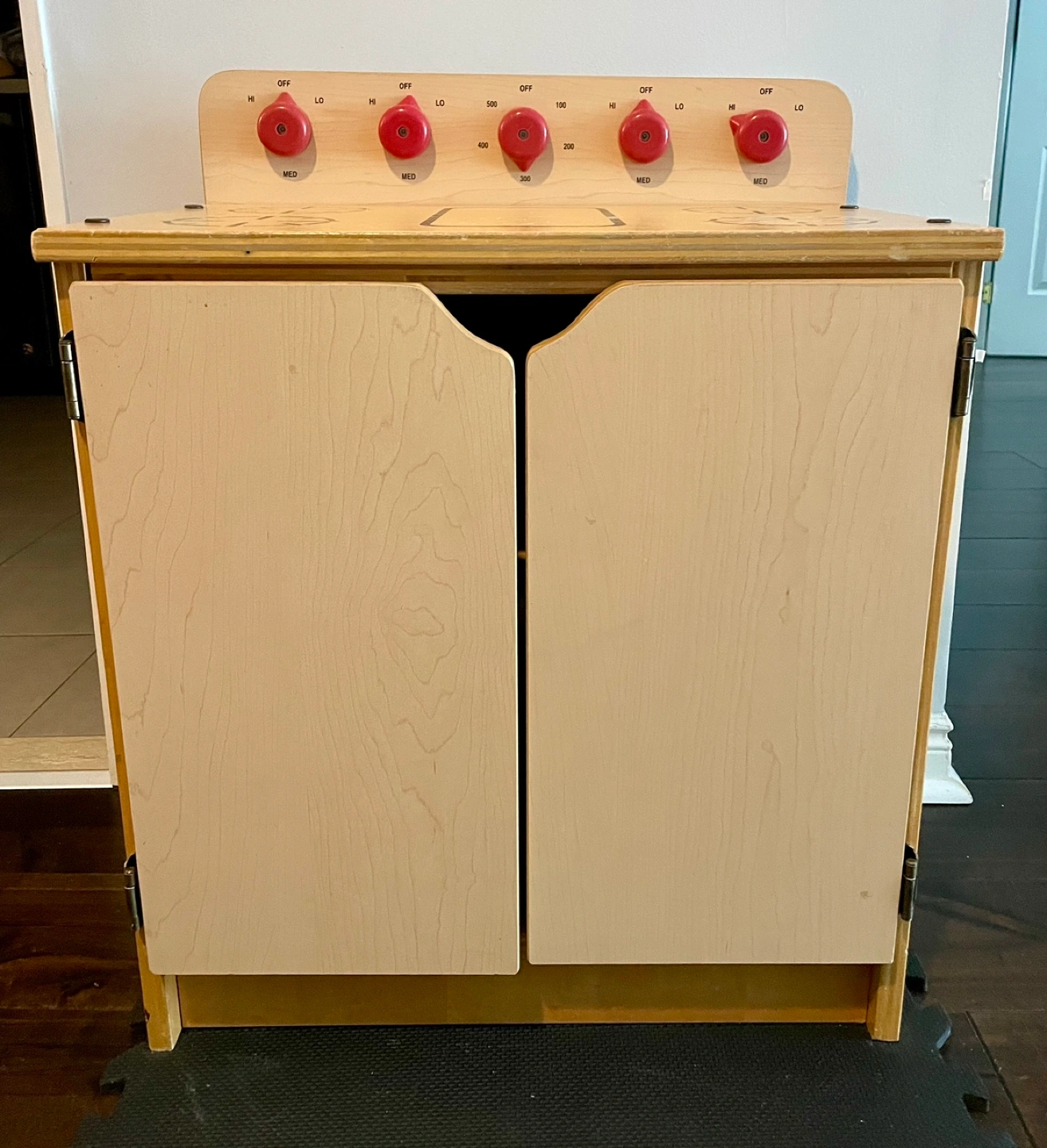 Trojan Classroom Furniture Wooden play kitchen stove with four burner stove top, oven with two doors and one shelf. Red knobs for each burner. Ideal for childcare or school. Original price over 250