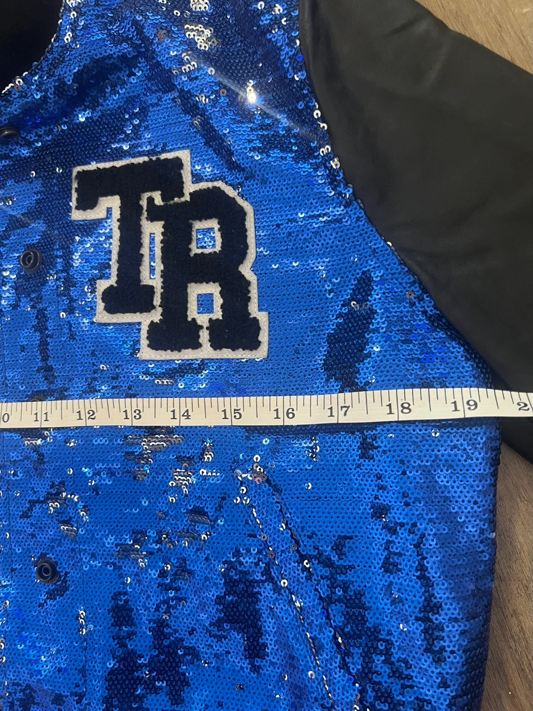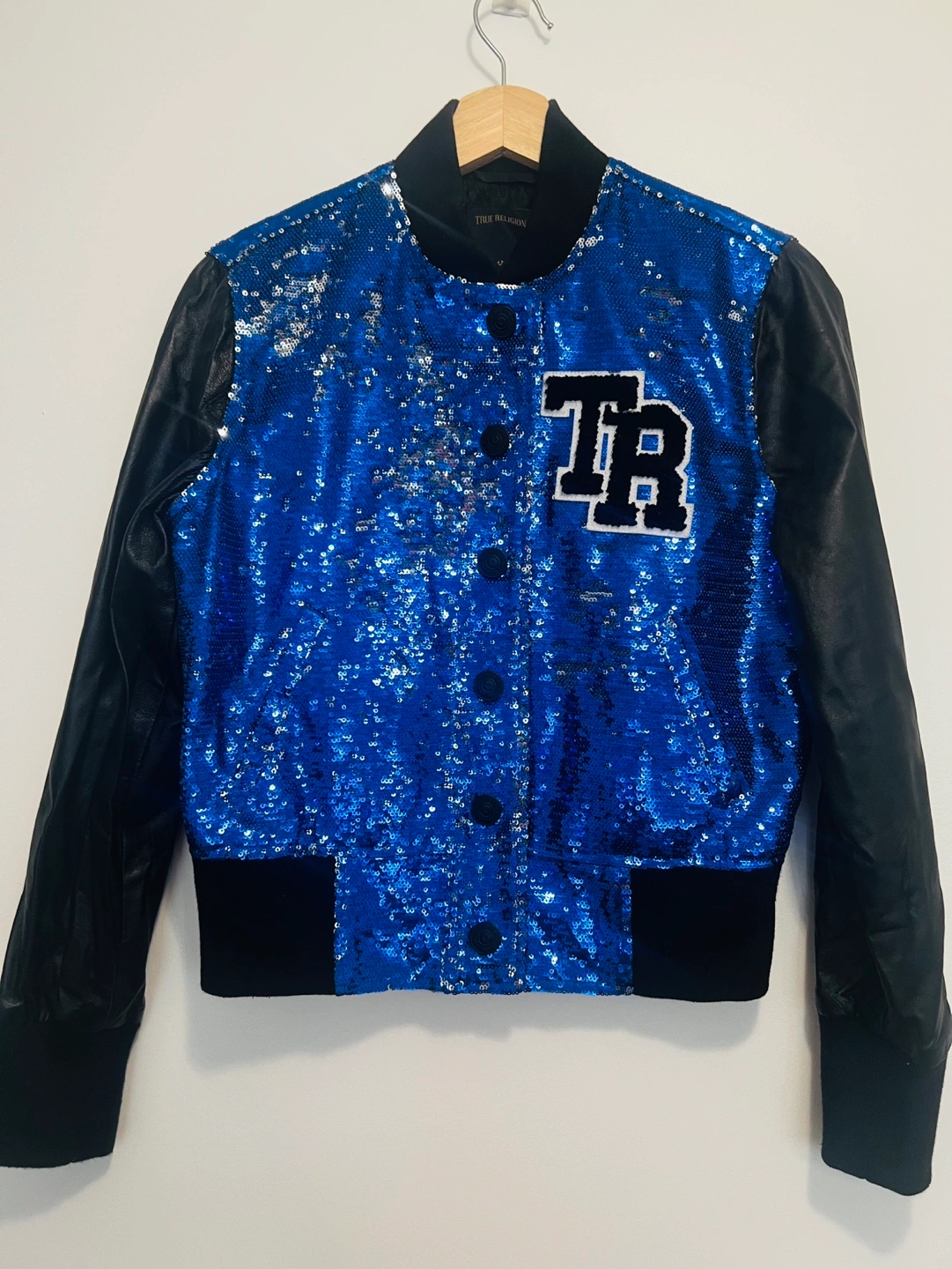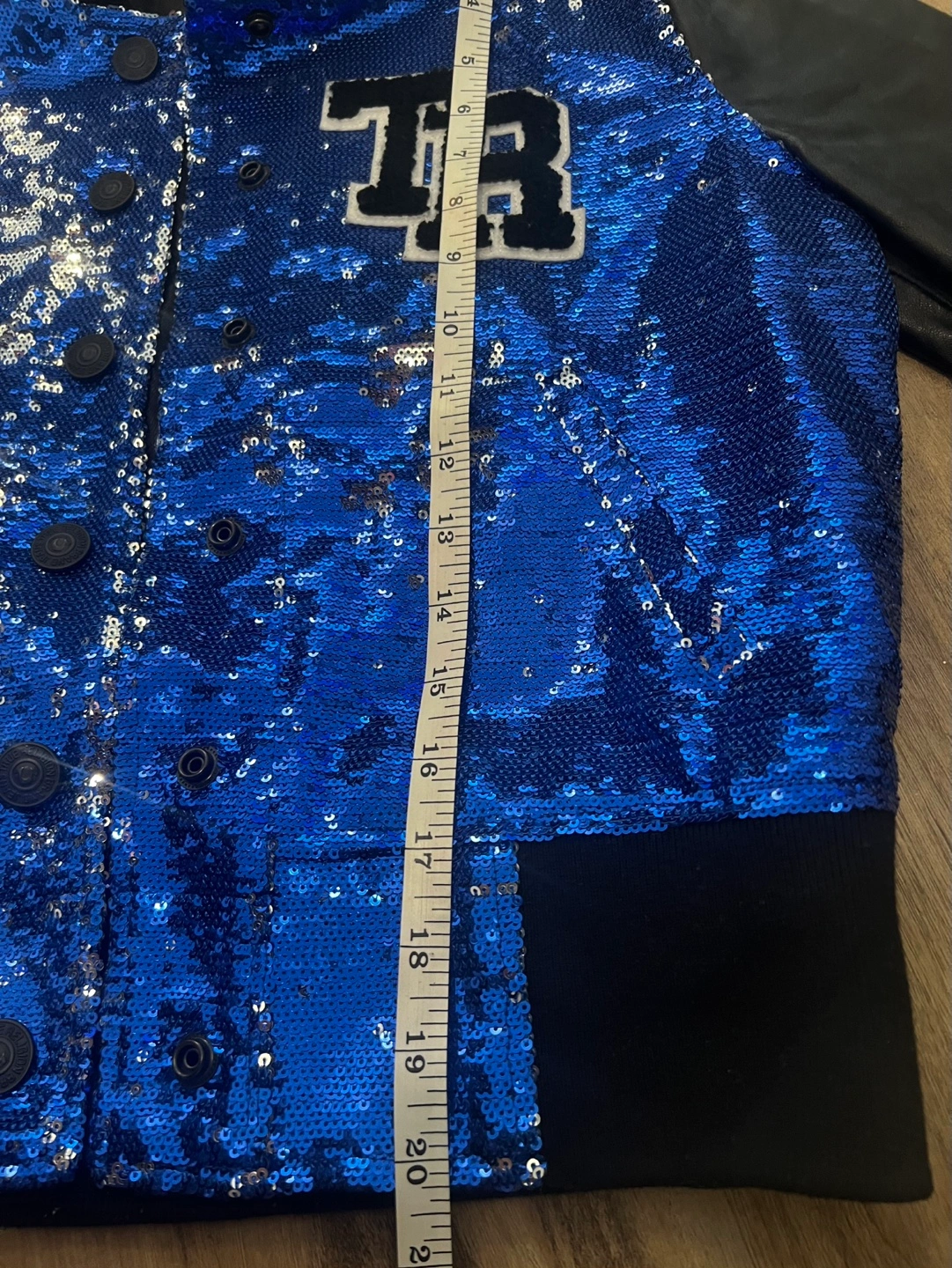 Gorgeous blue/silver sequin bomber jacket. Features black leather sleeves. TR logo. Worn 2-3 only. No flaws. No snags. Rare. Sold out online. Purchased in Las Vegas last year. Paid $390+ Meet at Yorkdale or STC. Or if that doesn’t work out I can meet you somewhere else. Let me know. 📍 Tags: varsity, bomber, party jacket, designer, authentic, rare. Check out my other items! 🛍️
