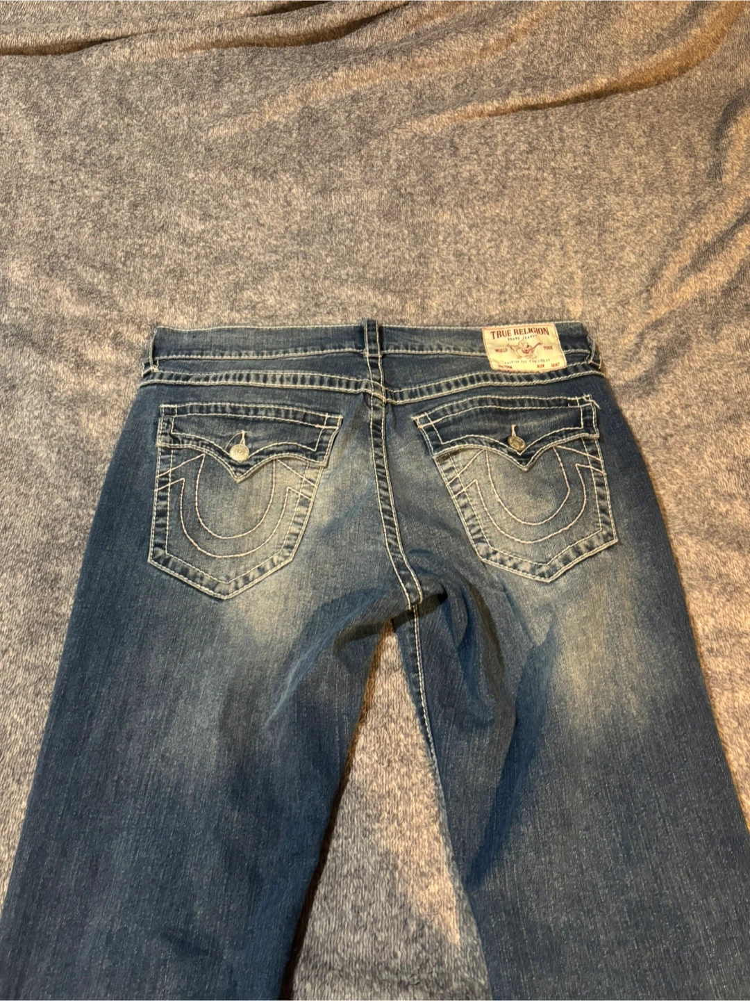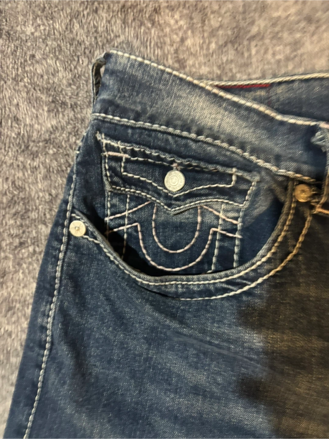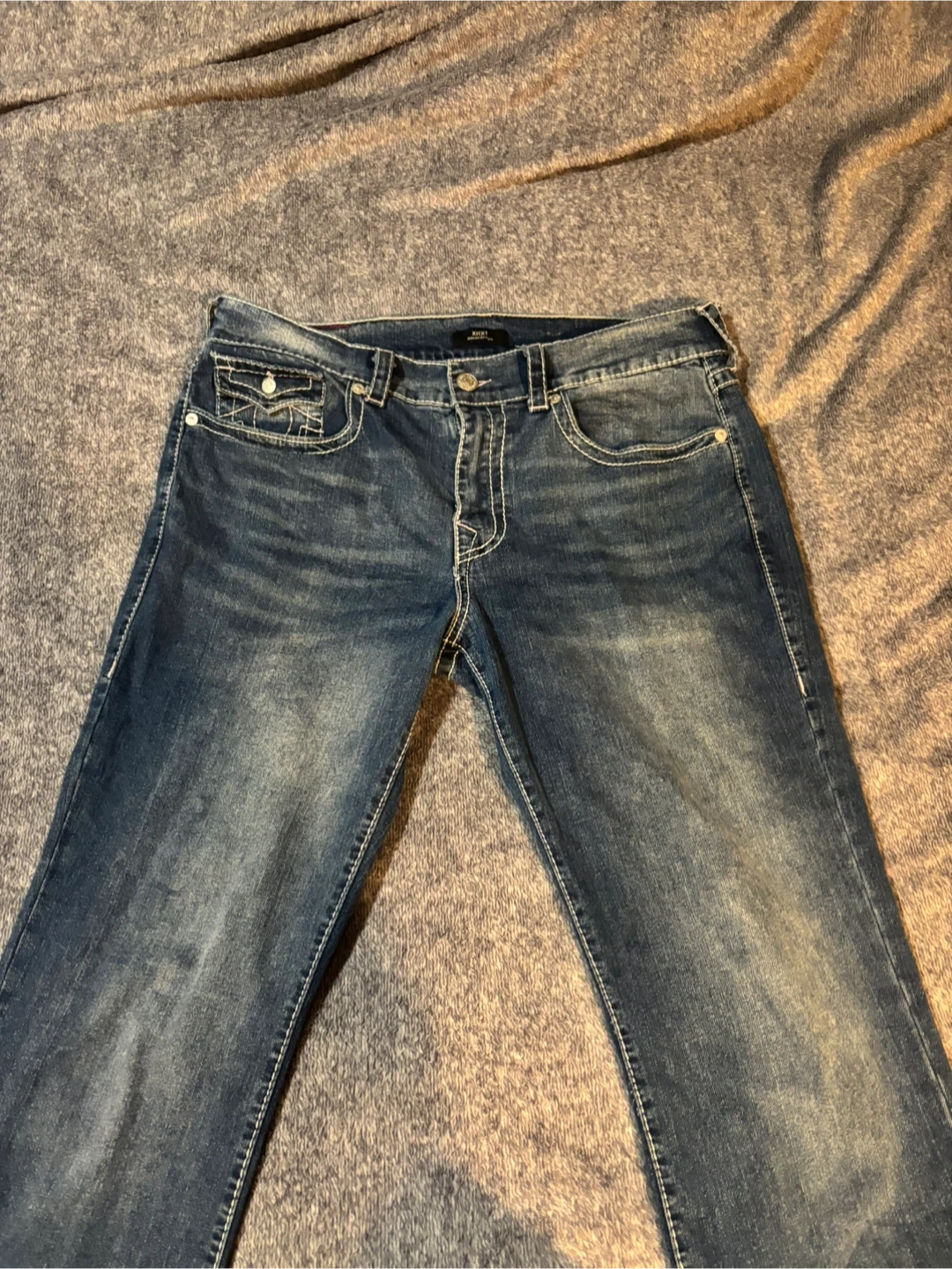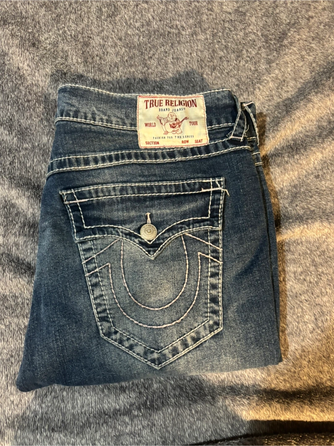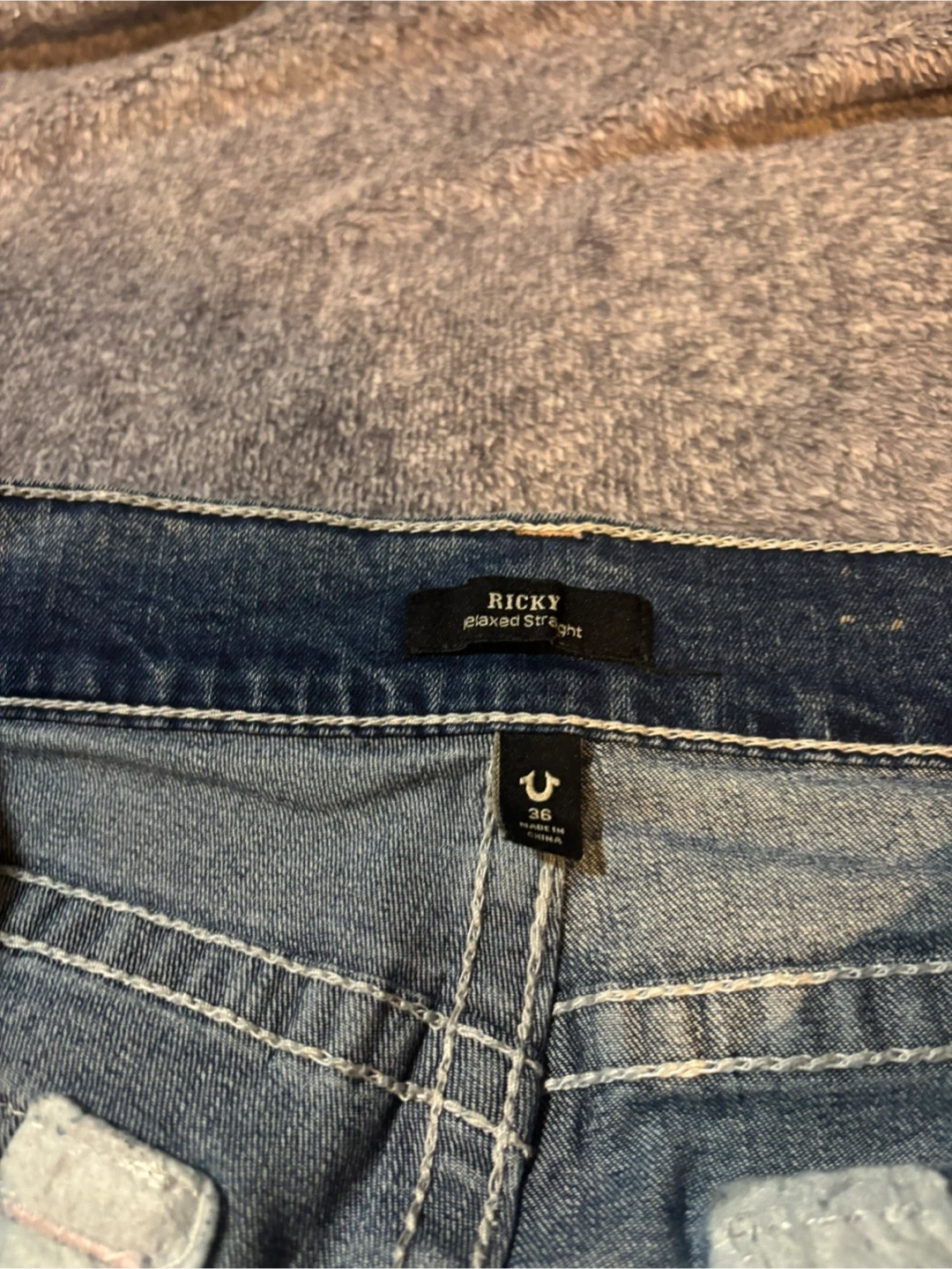 Selling a pair of True Religion jeans in size 36. These are the Ricky Relaxed Straight style, perfect for a comfortable fit. They feature the classic True Religion horseshoe logo on the back pockets. Great for everyday wear!