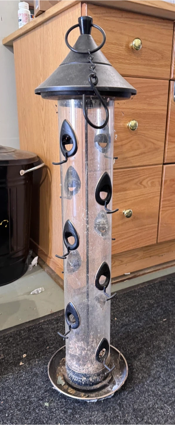 Selling a used tube bird feeder. It stands approximately 28 inches tall. It has multiple feeding ports for birds to enjoy. It's a great addition to any backyard!