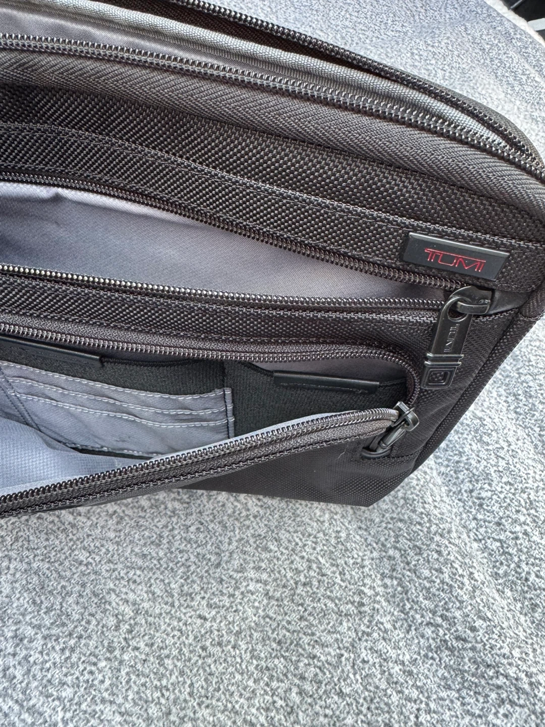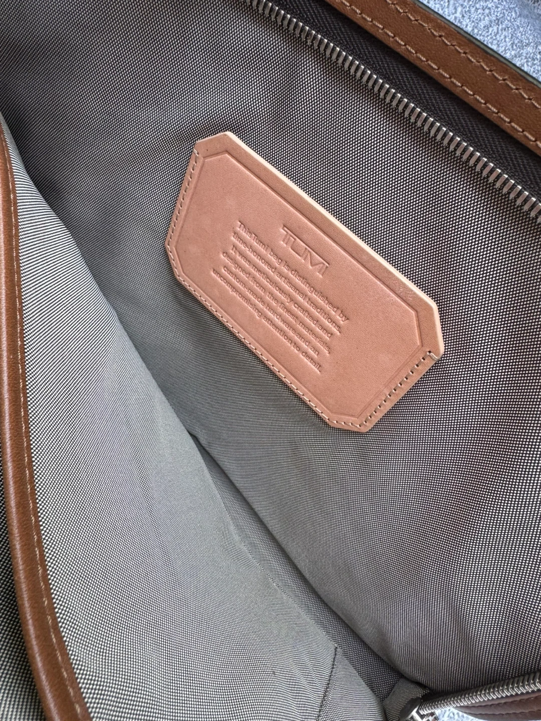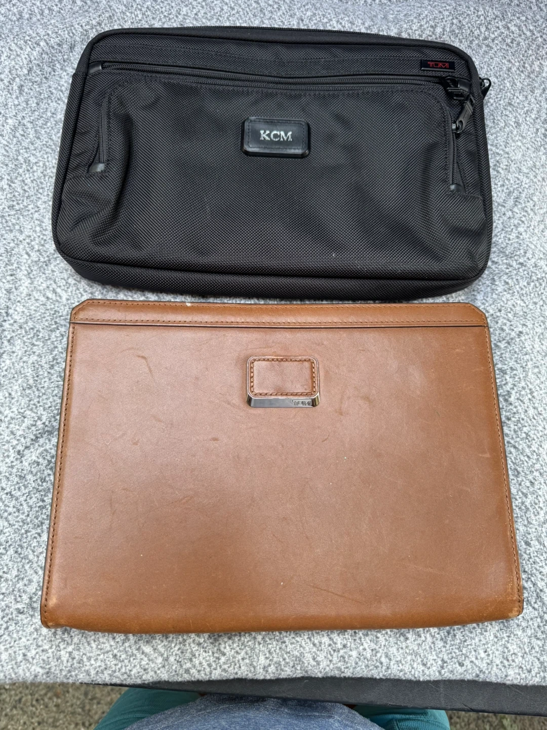 Two Tumi bags for sale! One is a black nylon bag with a KCM logo. The other is a brown leather portfolio. Both are in good condition and perfect for work or travel
