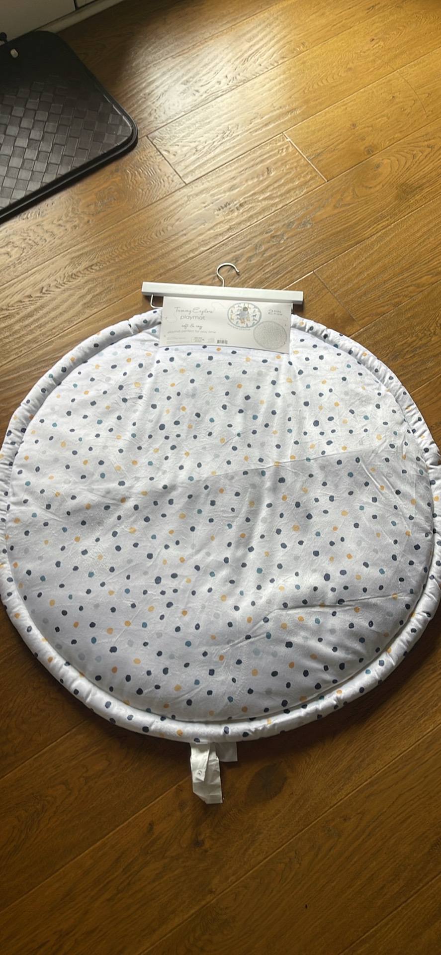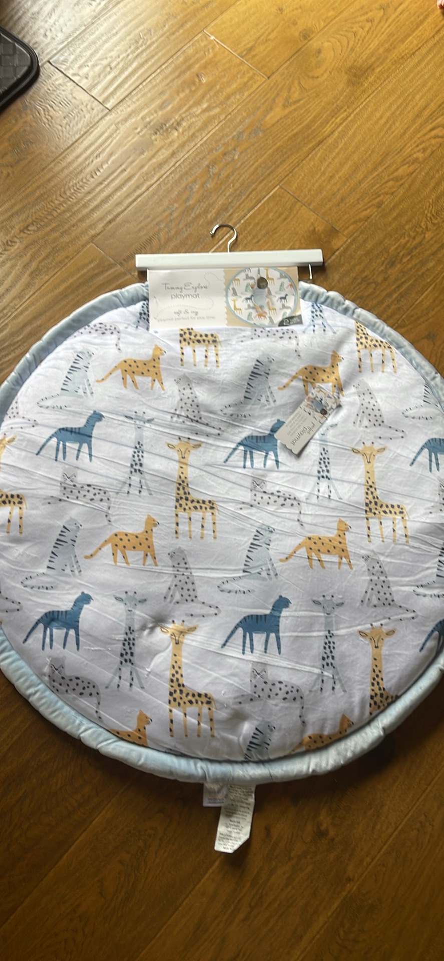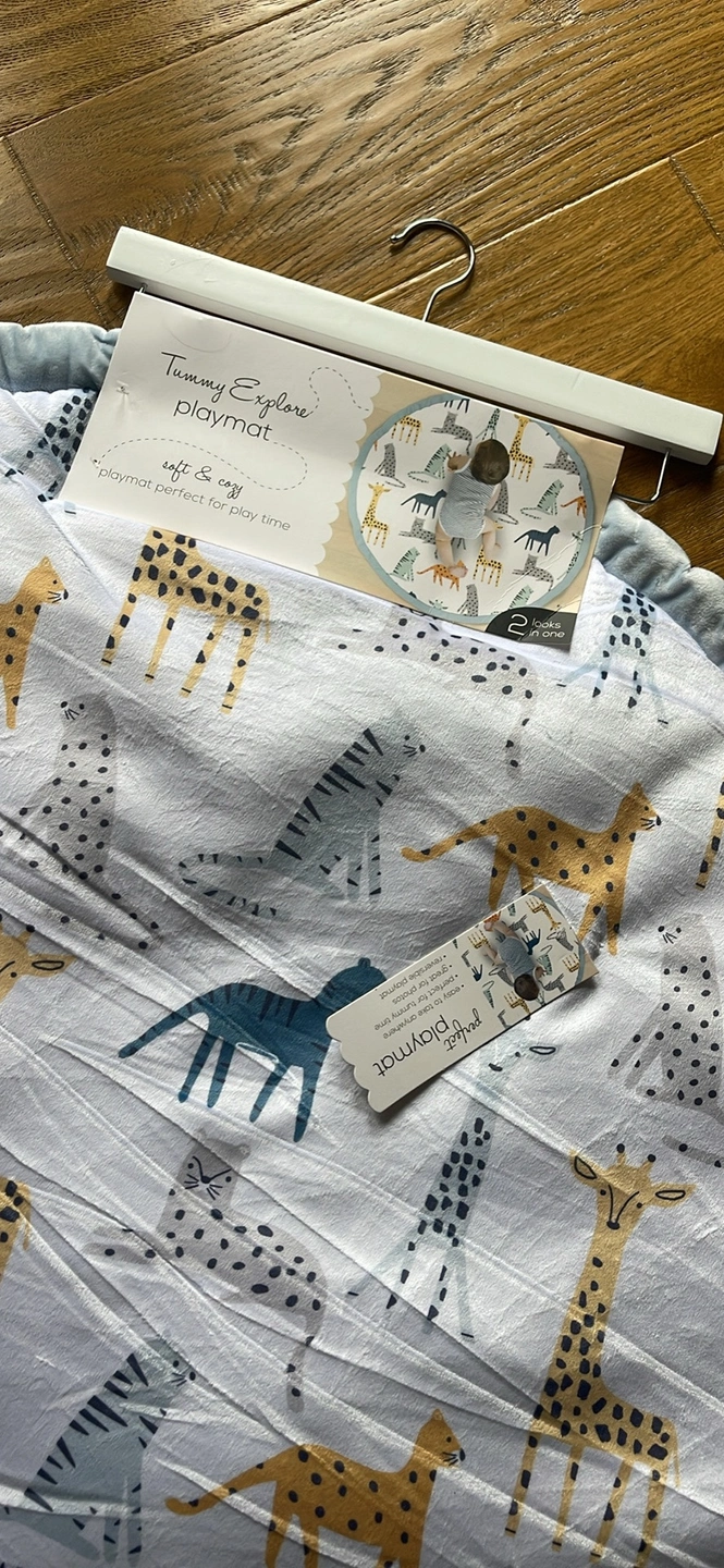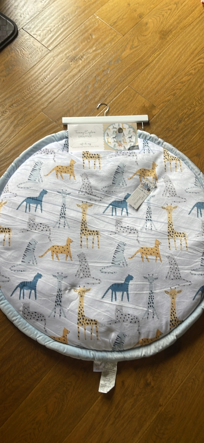 A round playmat with a blue velvet trim. It has a white background with various animals printed on it. The mat is reversible with a white background with blue, yellow, and black dots on the other side.