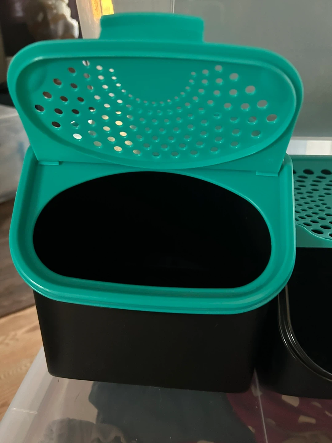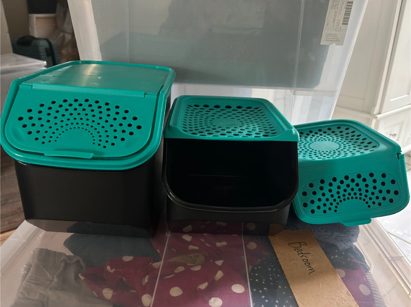 Brand new, never ended up using them. They were a present that I just don't have the space to use. Being sold as a set! To buy from Tupperware the three would cost $140. Price is firm. Three containers can be stacked for a smaller footprint. In a nice black/teal colour way. Largest container designed to hold about 10 lbs of potatoes. Medium to hold 5 lbs of onions. Smallest is designed to hold 6 or so bulbs of garlic. With airflow in mind, this will keep your food for longer, ensures clean and organised storage, and is more attractive than random bags sitting in the pantry!