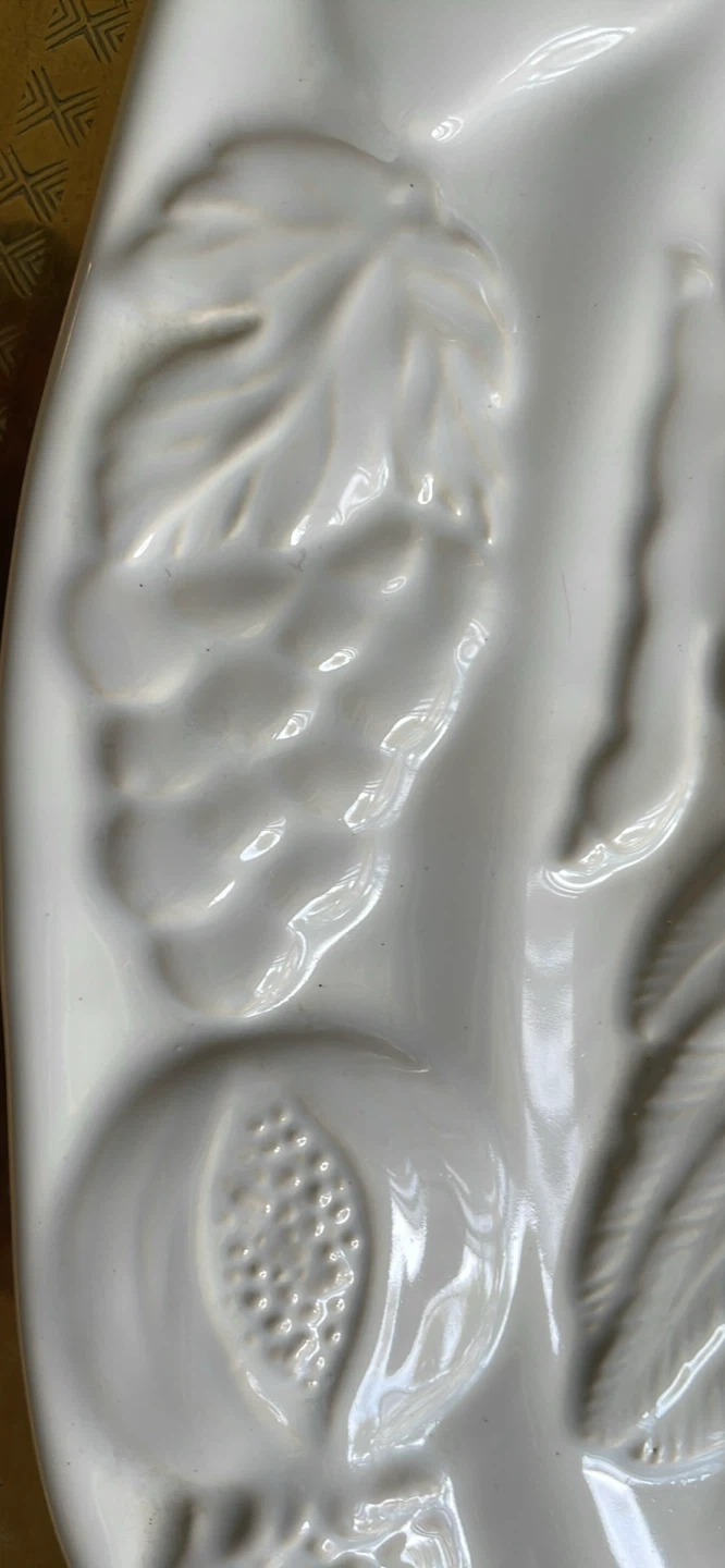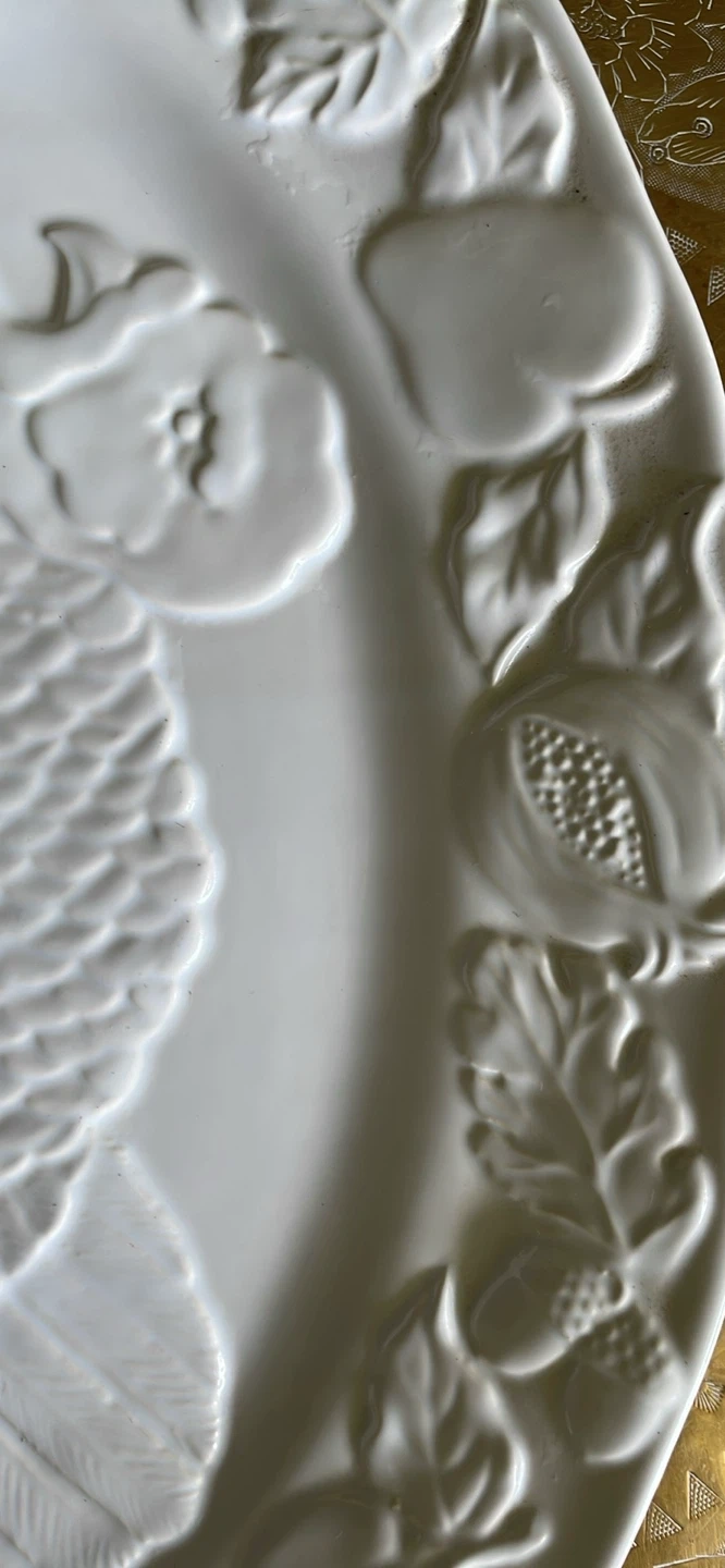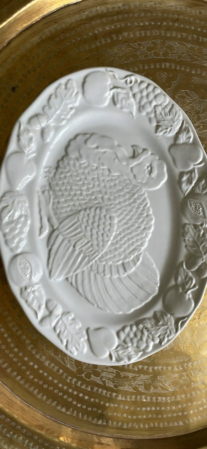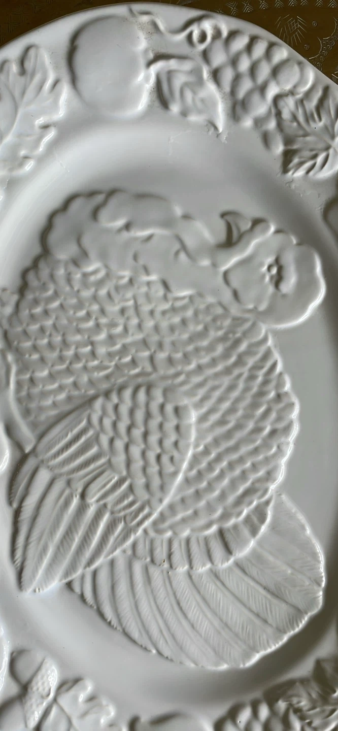 THANKSGIVING LARGE TURKEY SERVING PLATTER . WILL ENHANCE YOUR TABLE. Excellent condition. NEW WHITE WITH BEAUTIFUL RAISED TURKEY DESIGN AND FRUIT AND VEGGY BORDER. 18” long x 14” wide Pick up in Scarborough midland and Eglinton Fitzgibbon ave