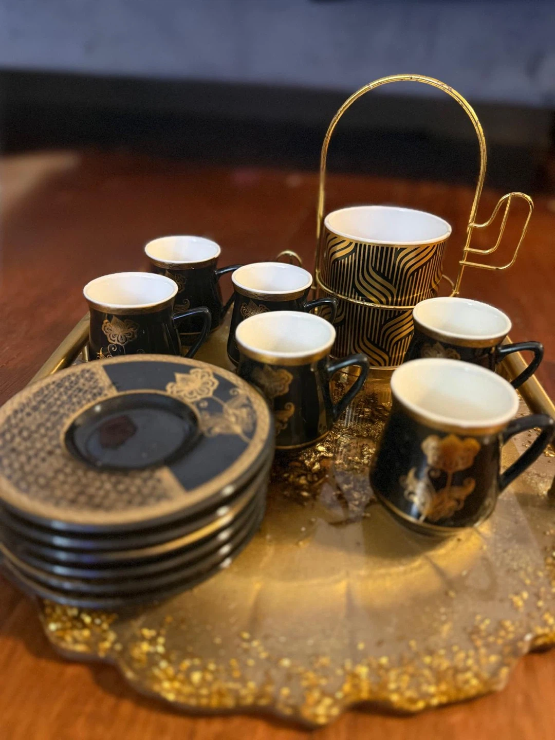 Selling a beautiful Turkish coffee set in black and gold! It includes six cups, six saucers, and a stylish holder. Perfect for adding a touch of elegance to your coffee time