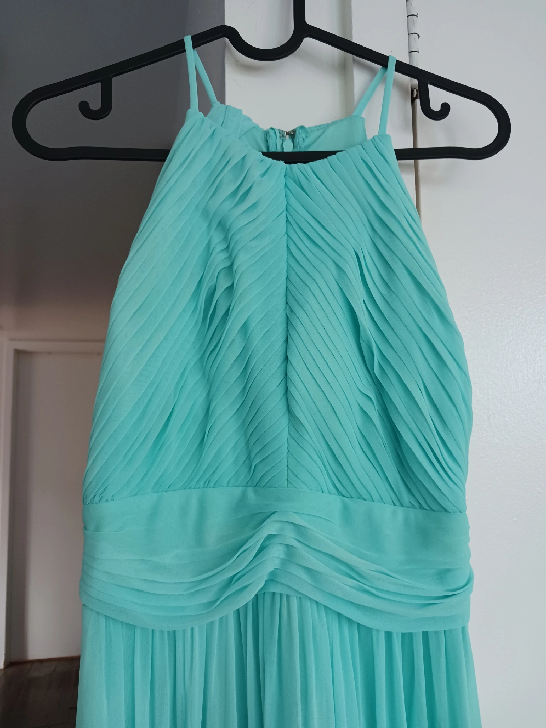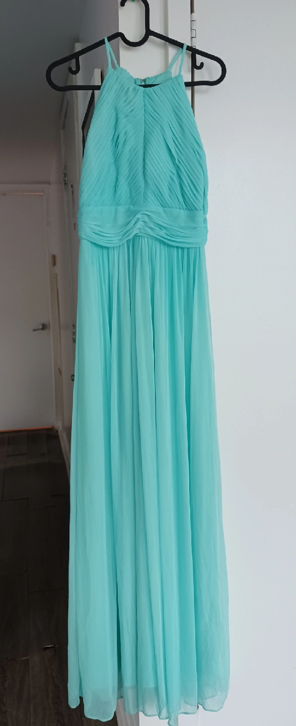 Selling a beautiful turquoise chiffon halter dress. It features a pleated bodice and a flowing skirt. Perfect for a special occasion!