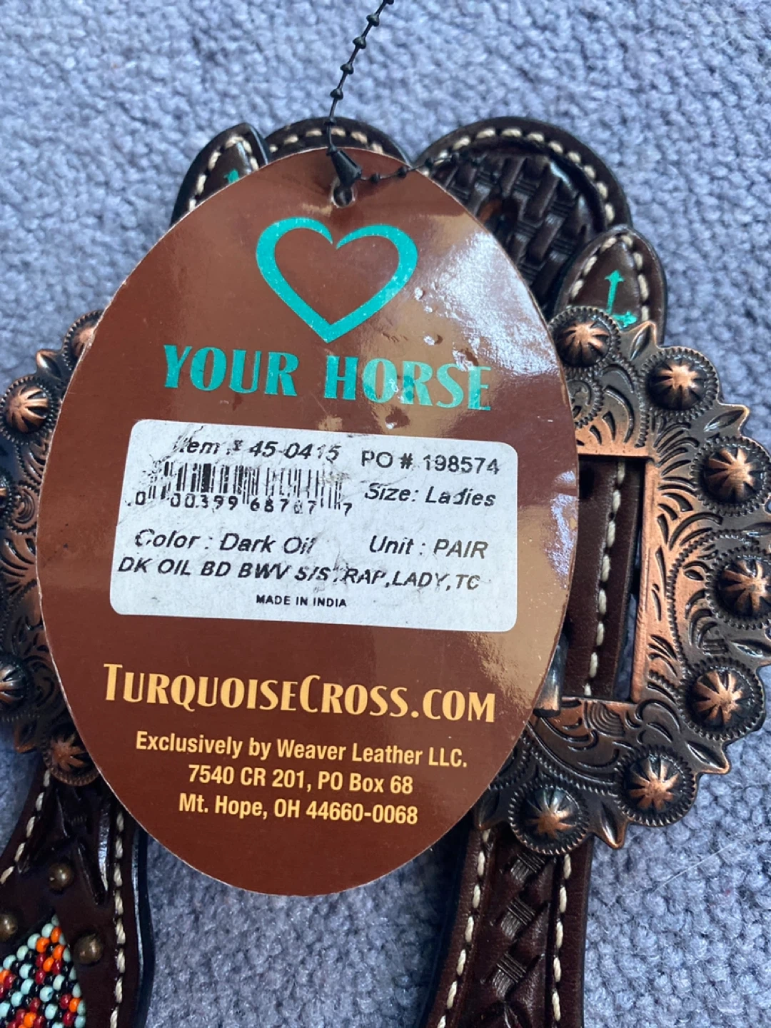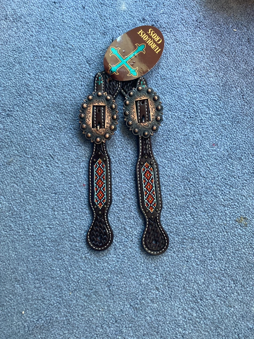 These Turquoise Cross ladies' spur straps are in dark oil colour. They feature intricate detailing and a stylish design. Size: Ladies. Unit: Pair. Made in India