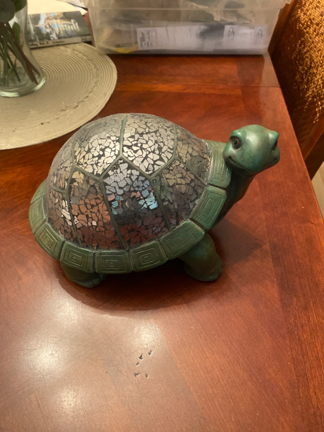 A cute turtle figurine for sale! It has a mosaic-style shell and a green finish. Perfect for adding a touch of whimsy to your home decor