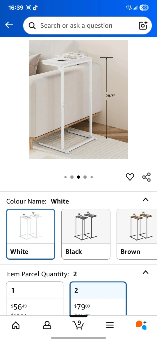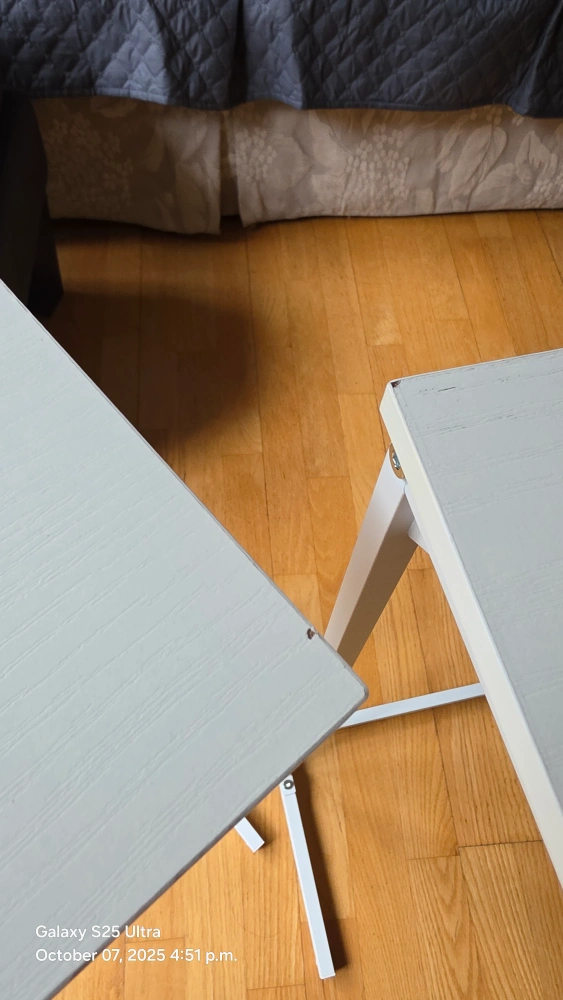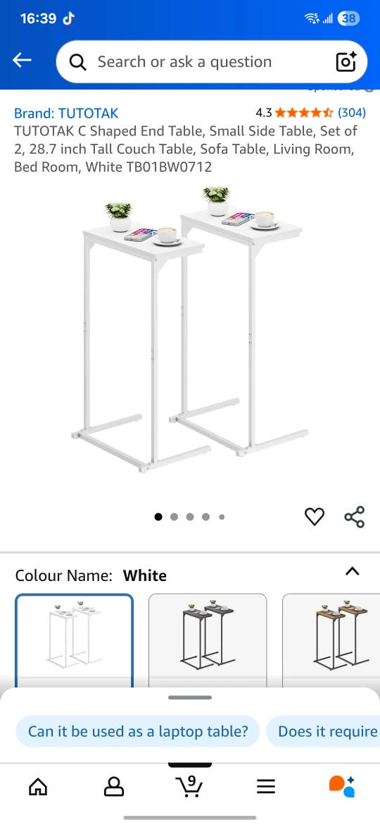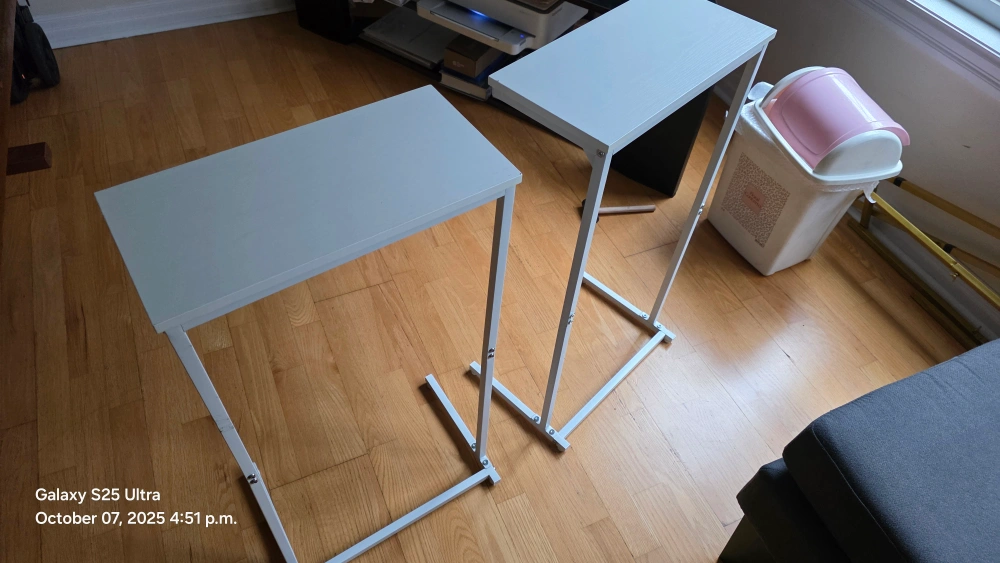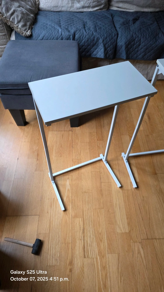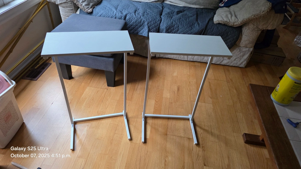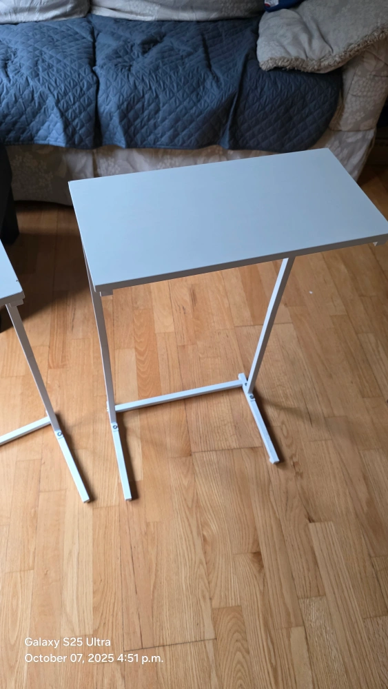 Selling a set of two TUTOTAK C-shaped end tables! They're white and in great condition. These small side tables are perfect for a sofa, living room, or bedroom. The height is 28.7 inches. They can be used as laptop tables too! minor factor defect ( minute chips) as in the pictures