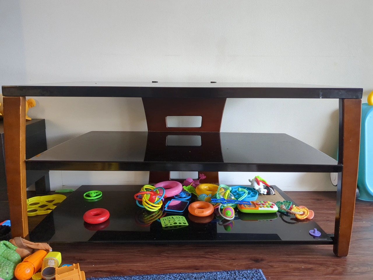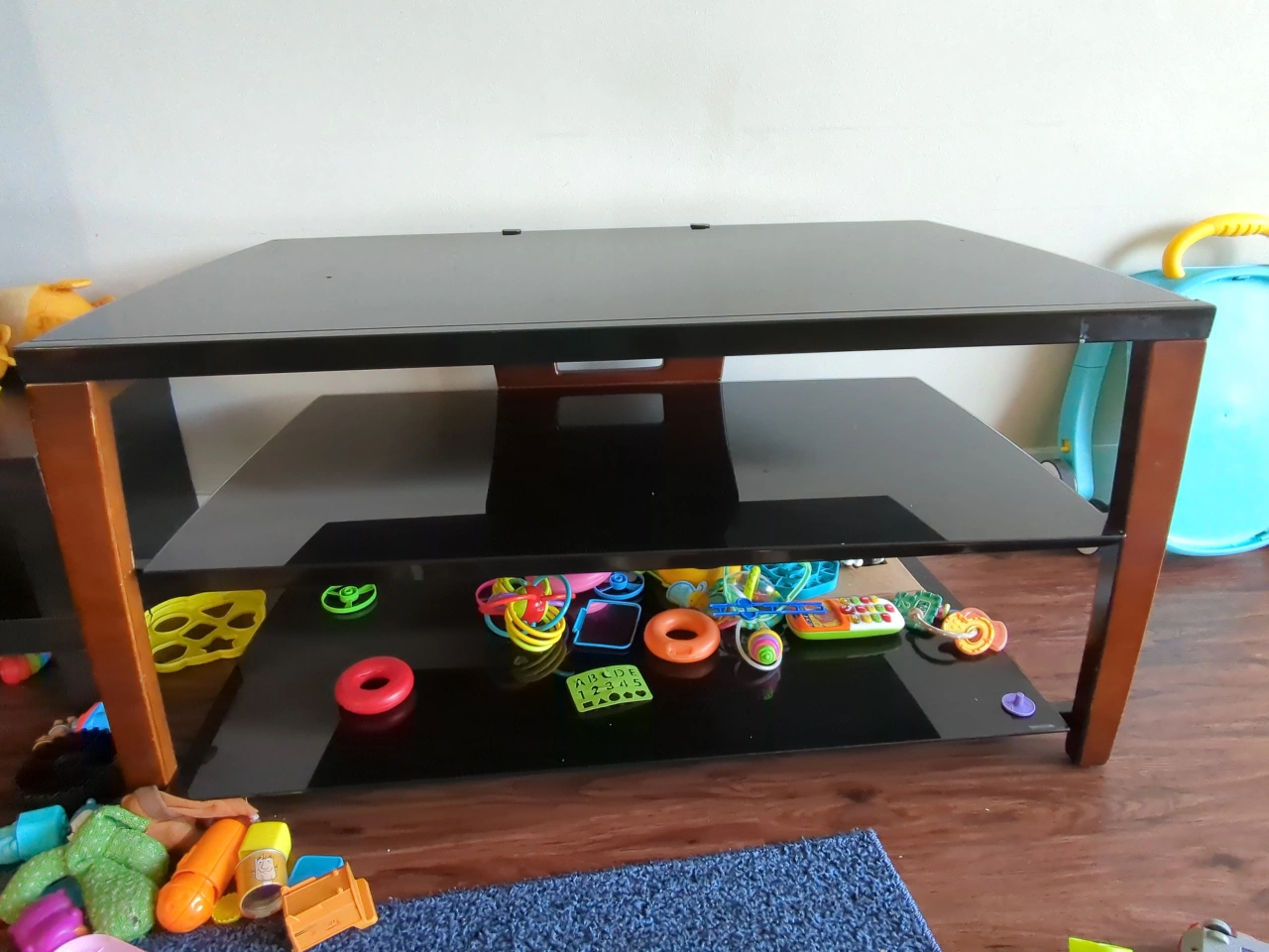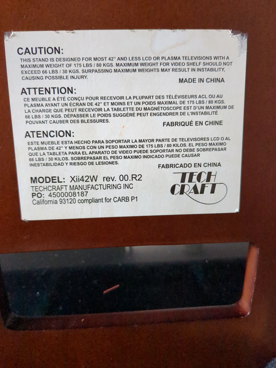 Selling a Tech Craft TV stand. It's designed for most 42" LCD or plasma televisions, with a maximum weight of 175 lbs / 80 kgs. Please note that exceeding maximum weights may result in instability. It has a black glass top and wood legs.