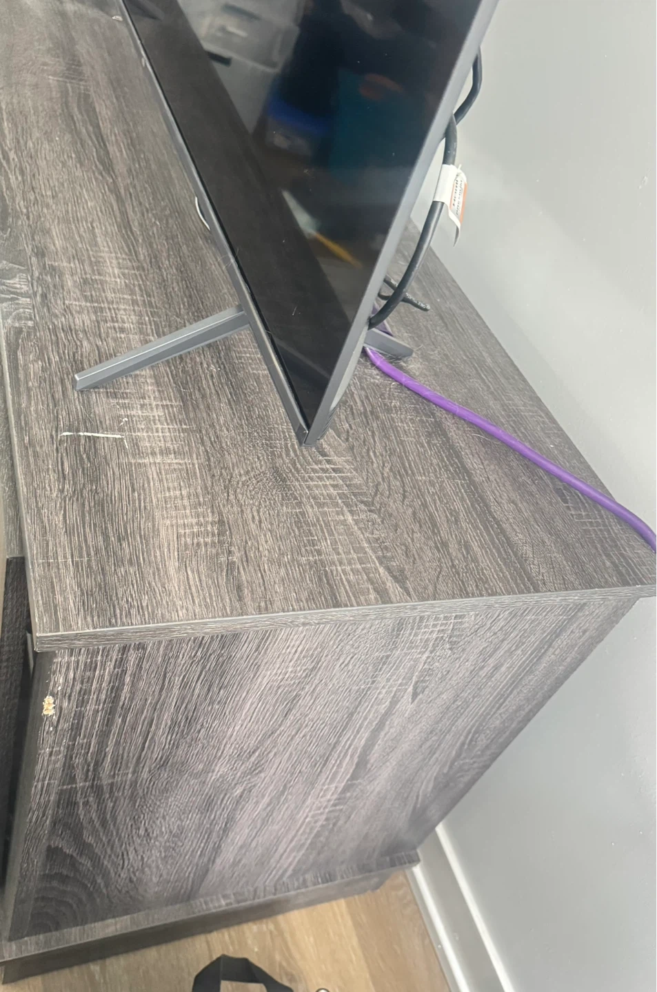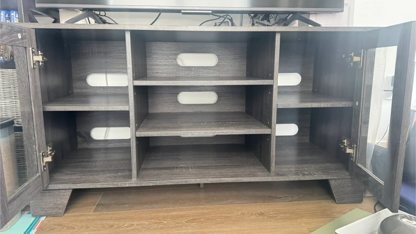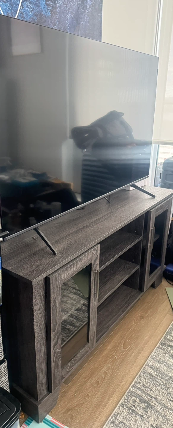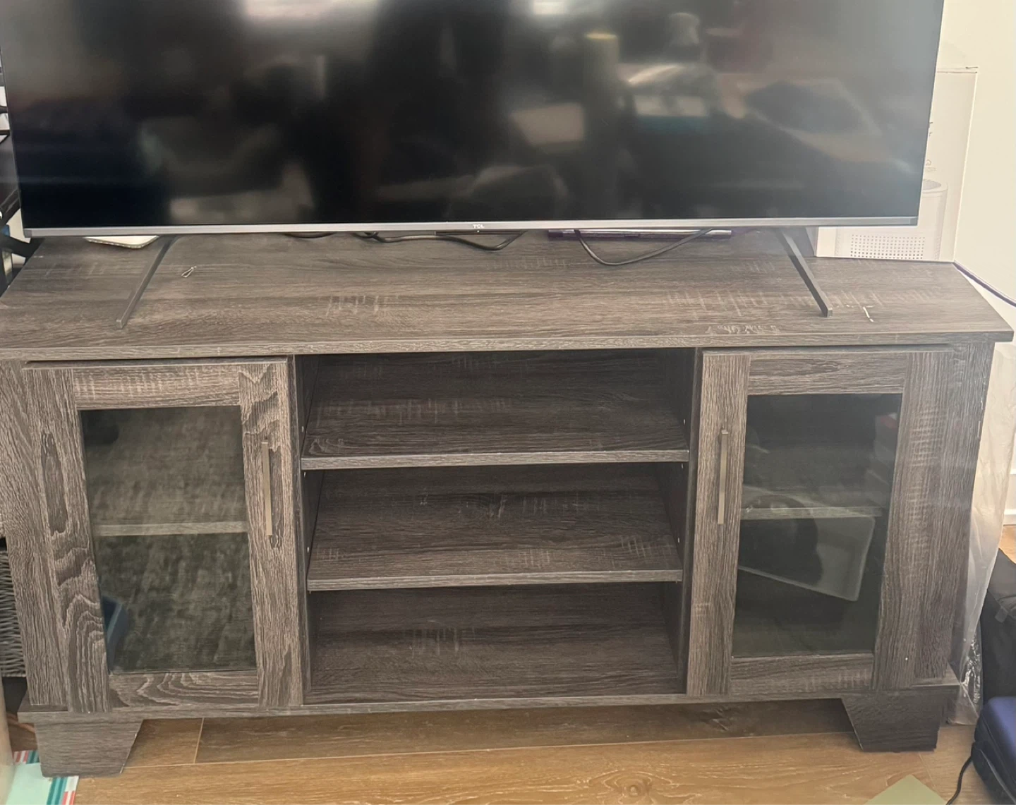 Selling a sturdy TV stand in a stylish grey finish! It features glass doors and plenty of shelving for your media devices and accessories. This stand is perfect for organizing your living room and displaying your TV. Pick up only