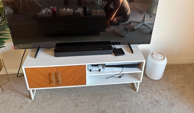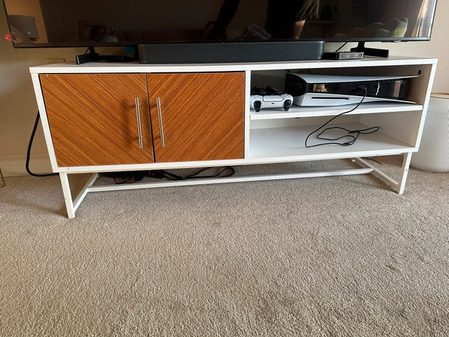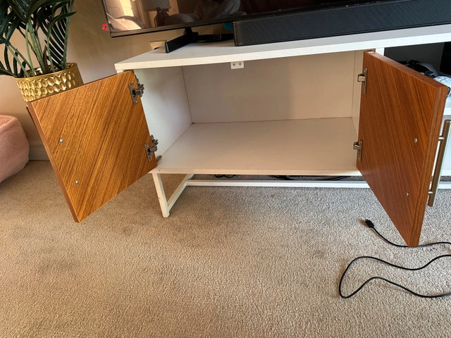 This TV bench can hold up to 88lbs and is suitable for TVs up to 50 inches, perfect for your living room and bedroom. The media cabinet features two open compartments and a cabinet with doors. Two wire holes are designed on the back for cable management. Constructed of crafted particle board and steel frame. Overall Dimension: 47.25"L x 15.25"W x 19"H, Weight Capacity: 88lbs (total), 11lbs (shelf).