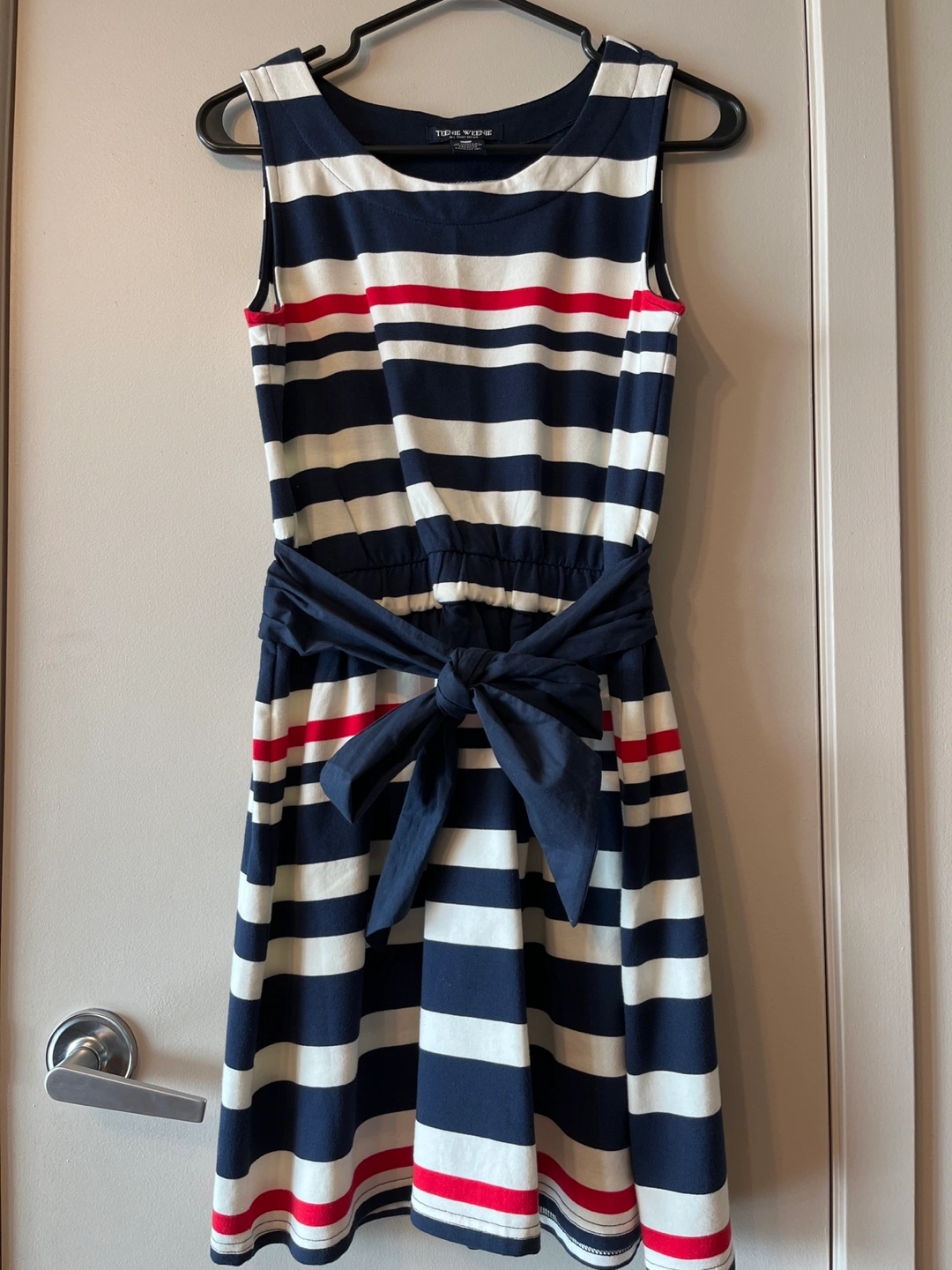 Cute Twee Weenie sleeveless dress with a navy blue, white, and red striped pattern! It features a navy blue tie at the waist. Perfect for a casual summer day!