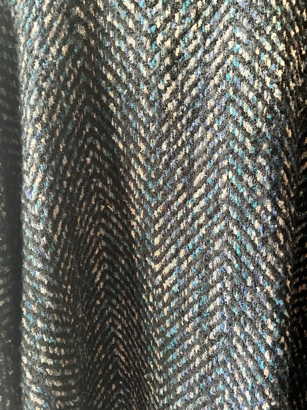 It features a stylish herringbone pattern and a cozy faux fur collar. It's a versatile piece that can be dressed up or down. The cape is an OSFM (One Size Fits Most) and is made of a blend of polyester, acrylic, and modacrylic. Attached at the neck with a button. Perfect for adding a touch of elegance to any outfit. Great for Fall! Never worn.