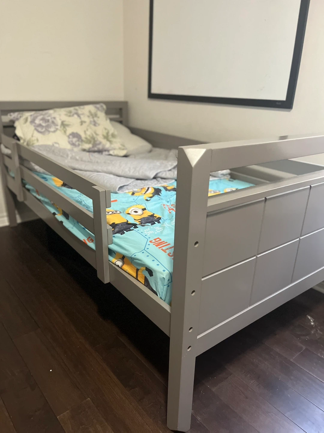 Two Twin Bed Frames for Sale These versatile twin bed frames can be used separately or stacked to form a bunk bed. Measurements (per bed frame): • Length: 81 inches • Width: 43 inches • Height: 35 inches Grey color with minor scratches. Price: $120 per bed frame * mattress not included *