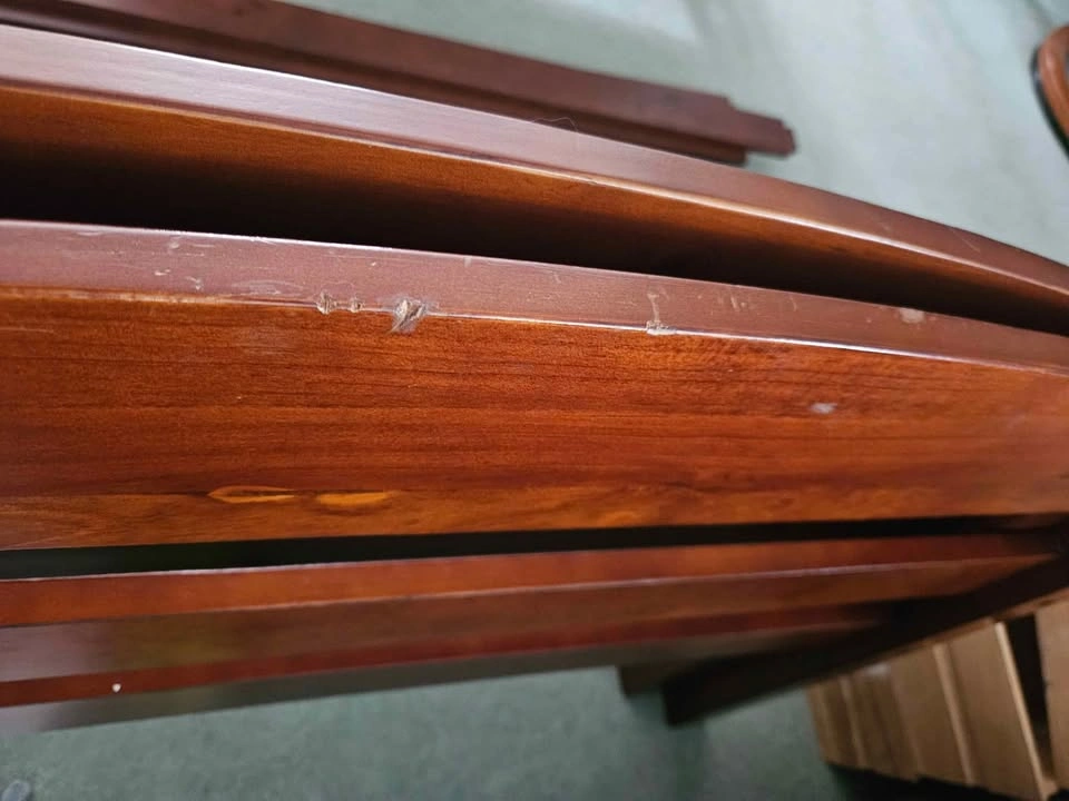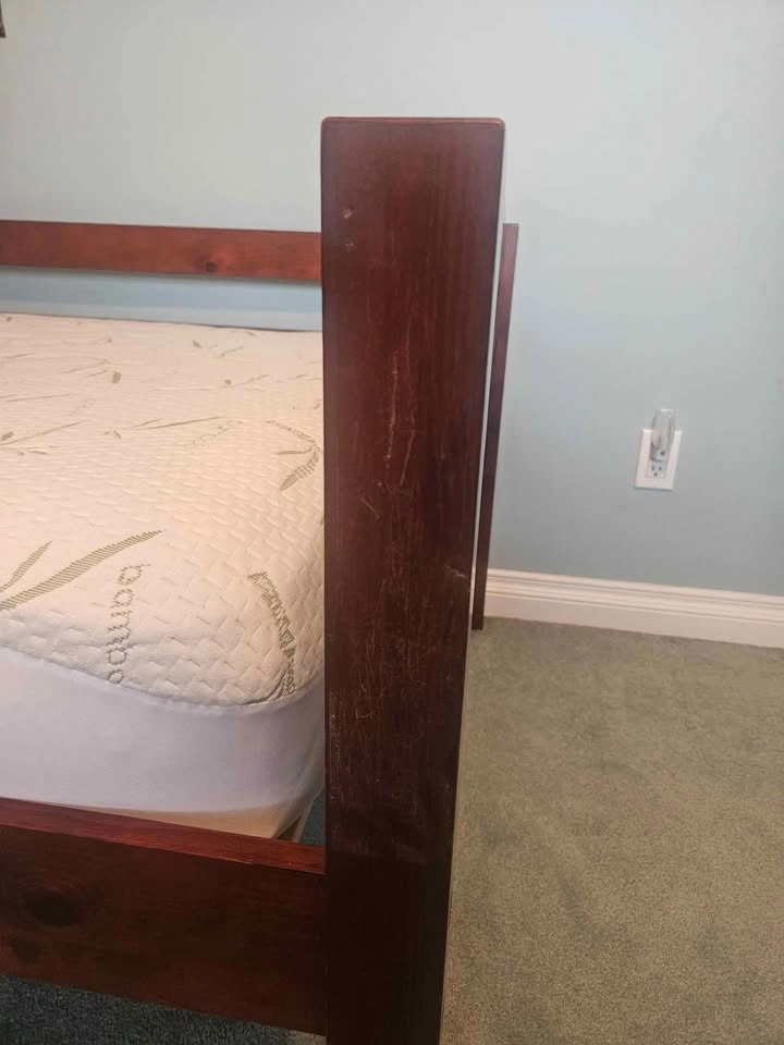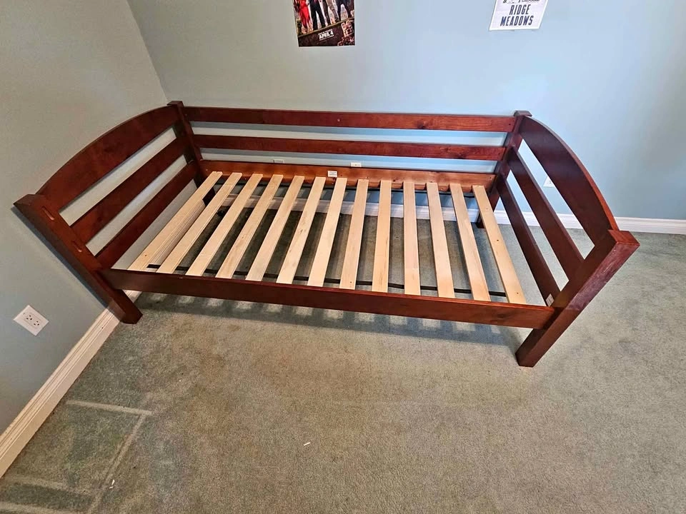 Wooden twin bed frame. No structural damage. Minor cosmetic wear on footboard. Sticker residue on post and minor scuff marks. See last pictures. Bed is disassembled and ready for pickup. Comes with all of the hardware. Pickup only from west maple ridge