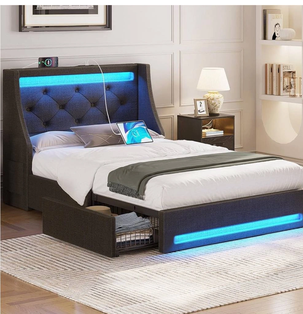 This is a twin-sized bed frame with a headboard that features LED lights that can change color and brightness. It also has built-in USB ports for charging devices. The bed frame has four storage drawers. our girl used it for a few months, and she just isn't enjoying it. she's 2 and needs something different. the bed frame is basically brand new. everything works, we have all pieces and super easy and light to set up. 250 obo