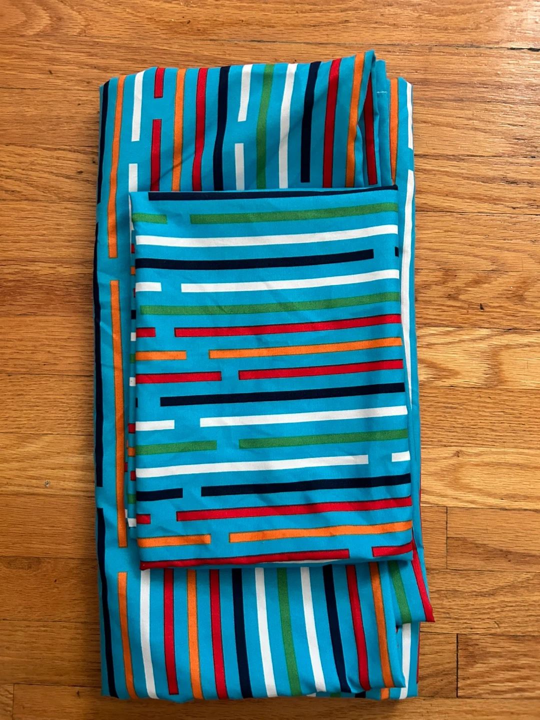 Here's a colourful bedding set with a fun, striped pattern! The fabric is soft and in great condition. It includes a fitted sheet, flat sheet and a pillowcase. Perfect for adding a pop of colour to your bedroom
