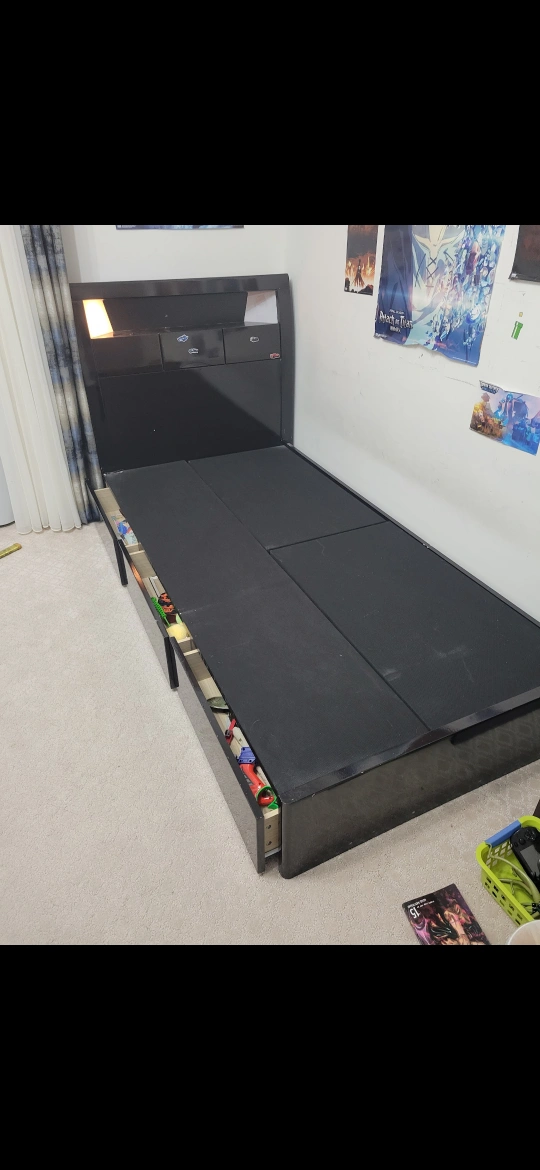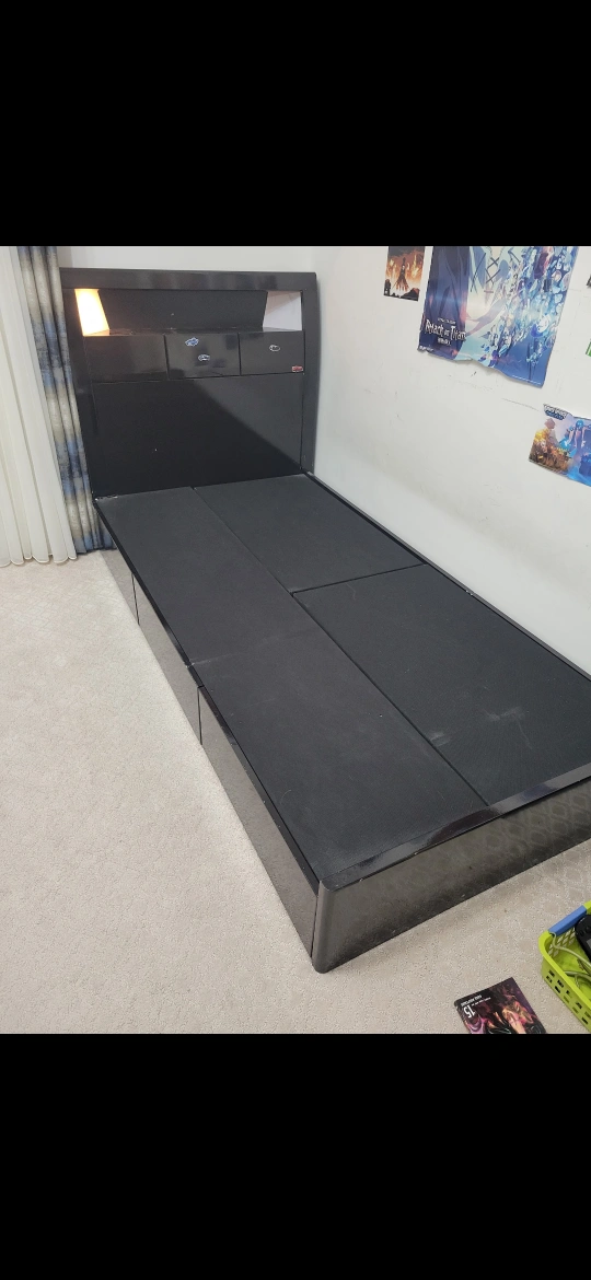 Selling a twin black bed with built-in storage. It's in good condition and has drawers underneath for extra space. Also, it has an electric outlet. Perfect for a smaller room or anyone needing a bit more storage!