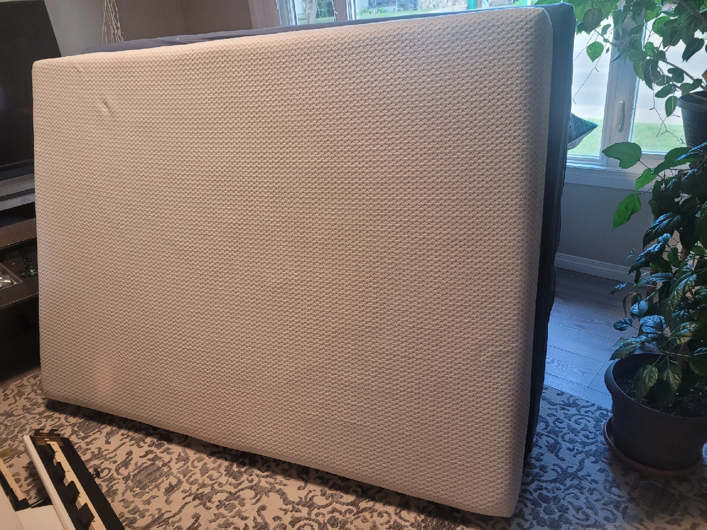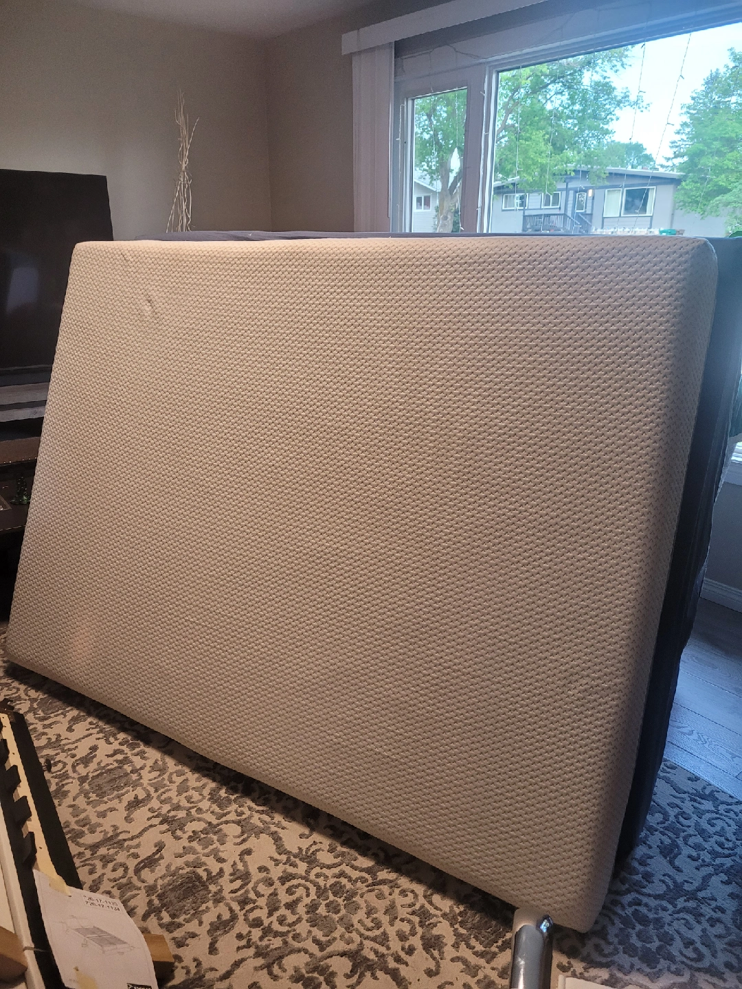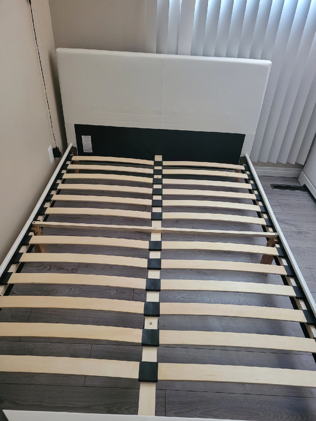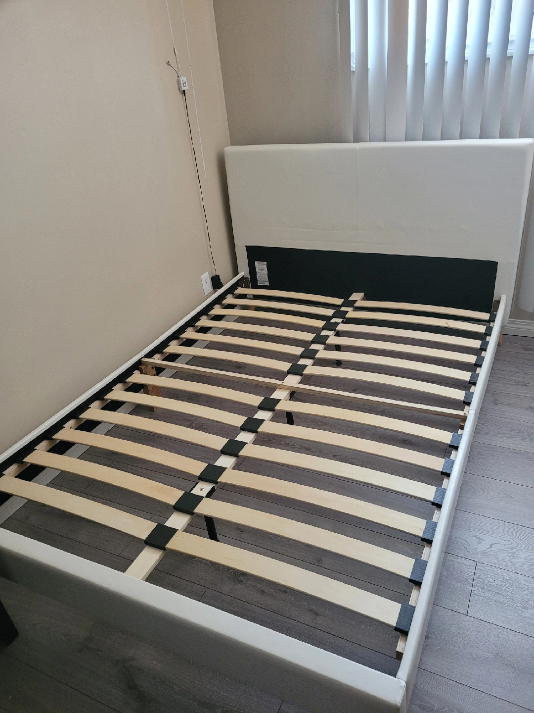 Selling a doble size bed frame and mattress. The frame is white with a headboard. The mattress appears to be in good condition as well. Great for a guest room or your own bedroom
