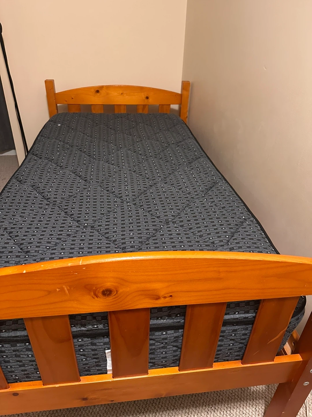 Selling 2 twin size bed frames and mattresses. The bed frames are made of wood and have a classic design. The mattresses are included and are ready for a new home. It's perfect for a kid's room or a guest room they can be combined as a bunk bed