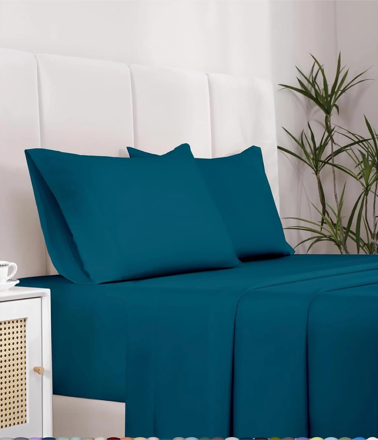 Selling a comfy teal sheet set! Includes a pillow case and a flat sheet. The sheets are designed to fit mattresses up to 16 inches deep. Great for adding a pop of colour to your bedroom! The last one shows the closest real colour