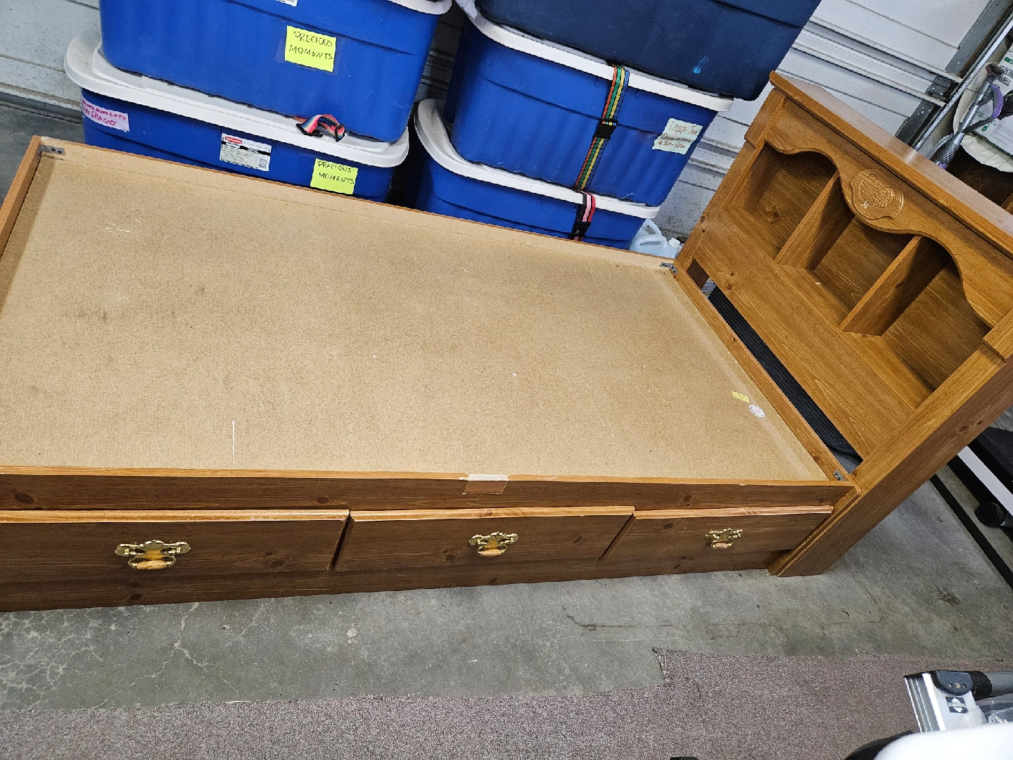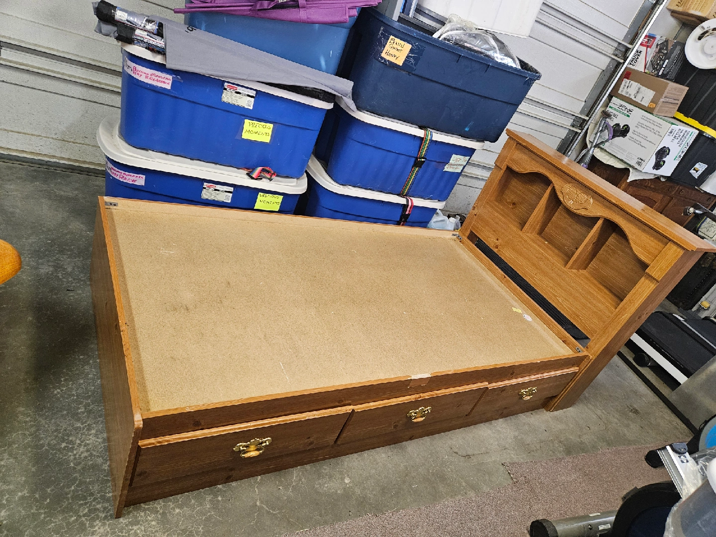 Selling a lovely wooden bed frame! It comes with a headboard that has built-in shelving, perfect for books or decor. The base also has drawers for extra storage. It's in good condition and ready for a new home!