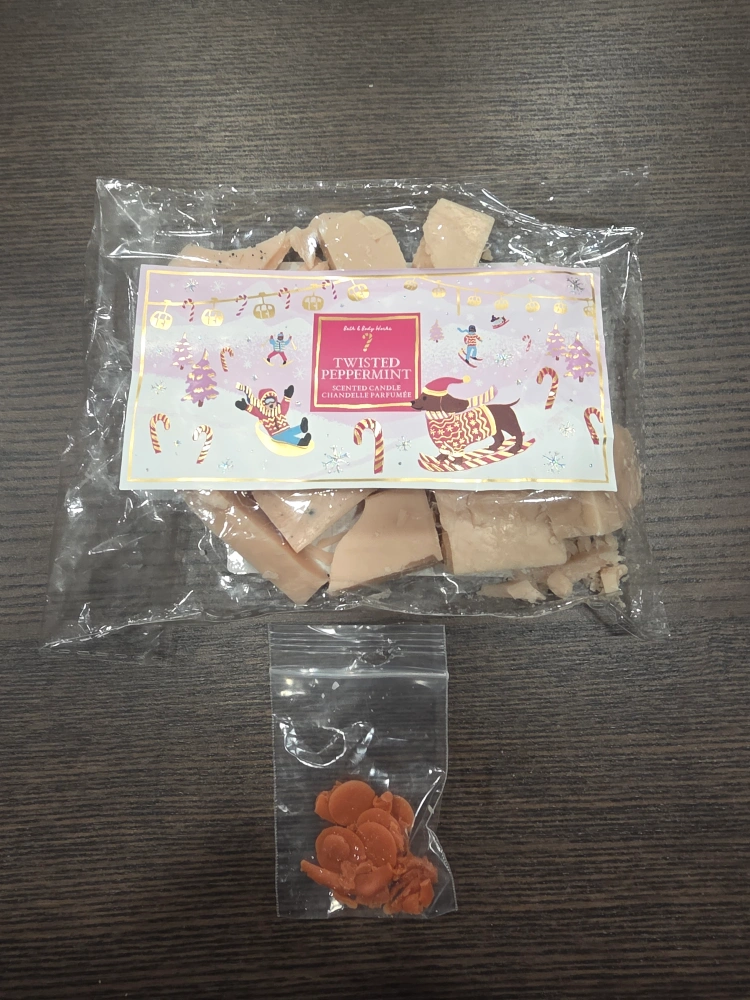 Twisted Peppermint scented candle melts and mini pumpkin melt I did not want to waste the candle, so I turned into wax melt and ready to used in a new home. PIck up is on pipeline road.