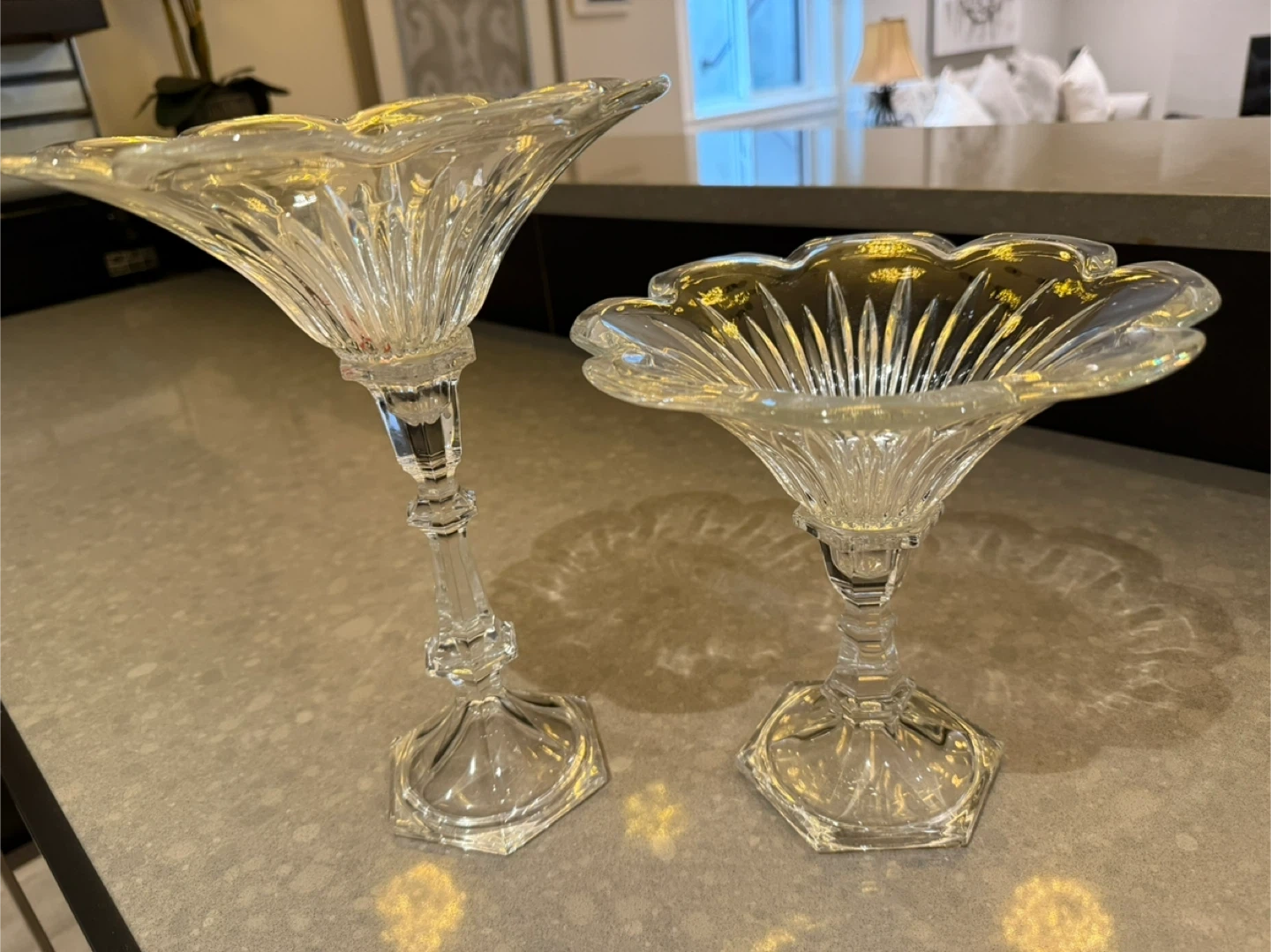 Selling two clear glass pedestal bowls or use as candles .They are in great condition and would be a lovely addition to any home