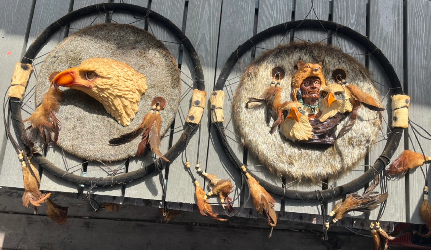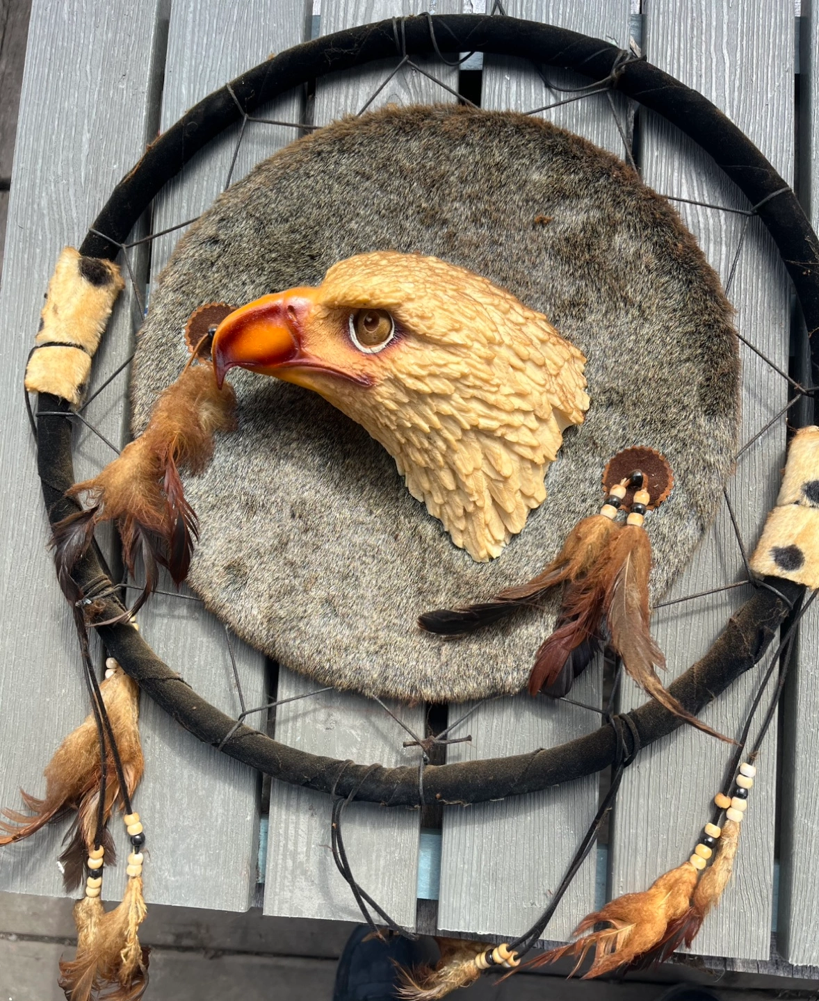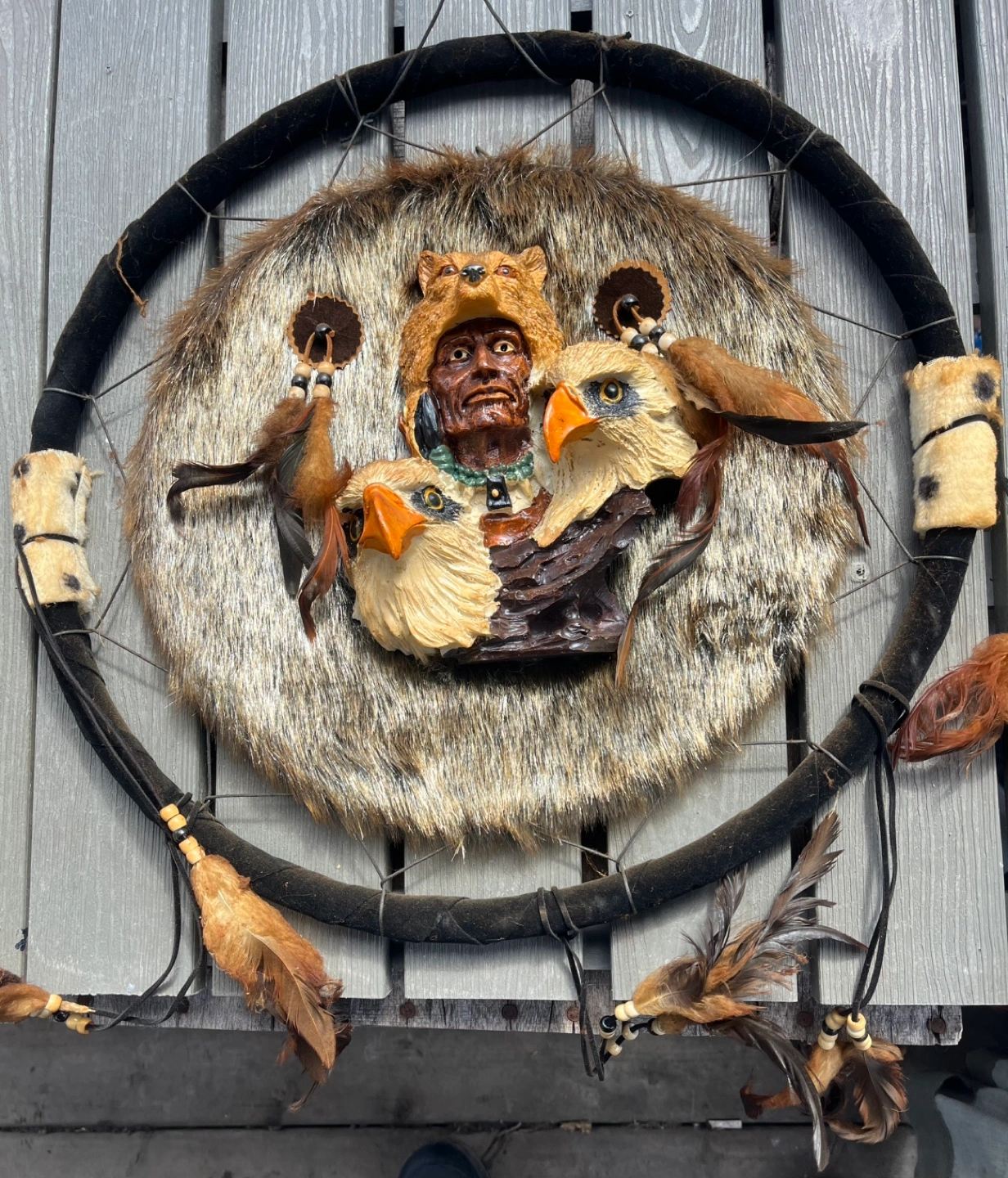 Pair of handcrafted dreamcatchers. Feature unique 3D carved sculptures. One depicts an eagle head, the other a Native American chief flanked by eagles. Brown leather and feathers included. Great decor. The price is for both.