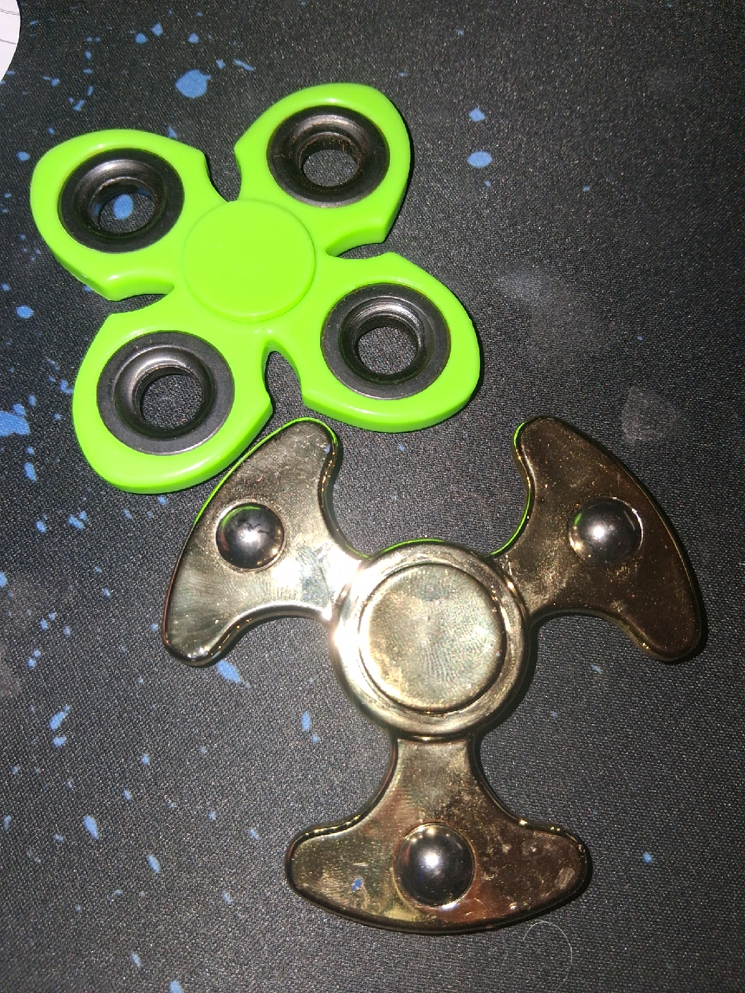 Selling two fidget spinners! One is a vibrant green, and the other is a shiny gold colour. They're both in good condition and ready for a new home