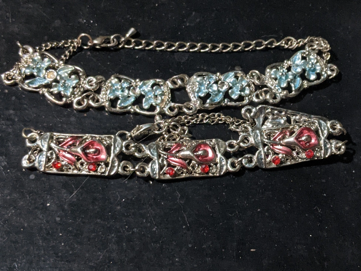 Two lovely silver bracelets with floral designs. One has light blue flowers, and the other features red flowers. They're in great condition and would make a beautiful addition to any jewelry collection!