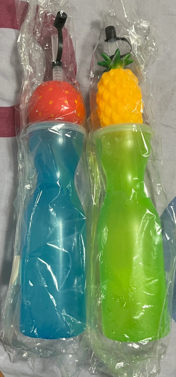 Set of two plastic water bottles. Each features a fruit-shaped top with integrated straw. Brand new never opened. Very fun and great for summer drinks by the pool!