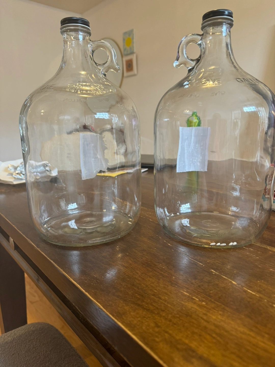 Selling two clear glass jugs, each with a one-gallon capacity. They're in good condition and ready for your homebrewing or other needs!
