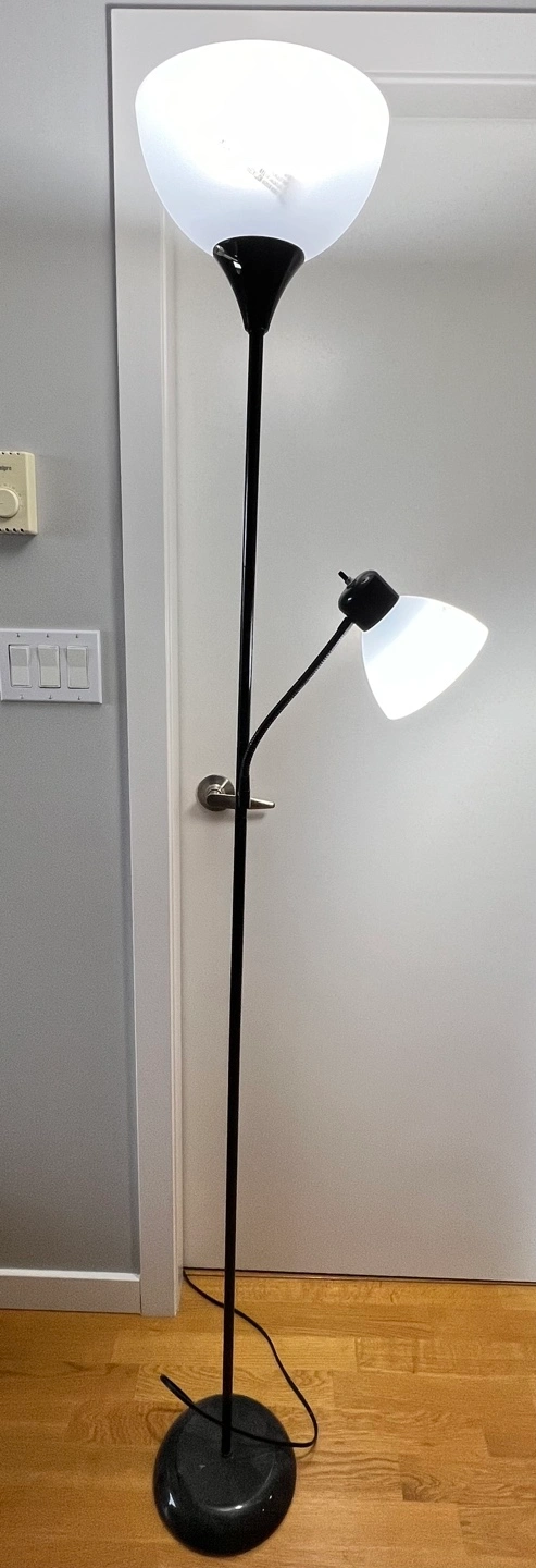 Two modern floor lamp. Features a tall black pole with a weighted base. Great for any room. Comes with daylight bulbs. Need to go asap. $15 each.