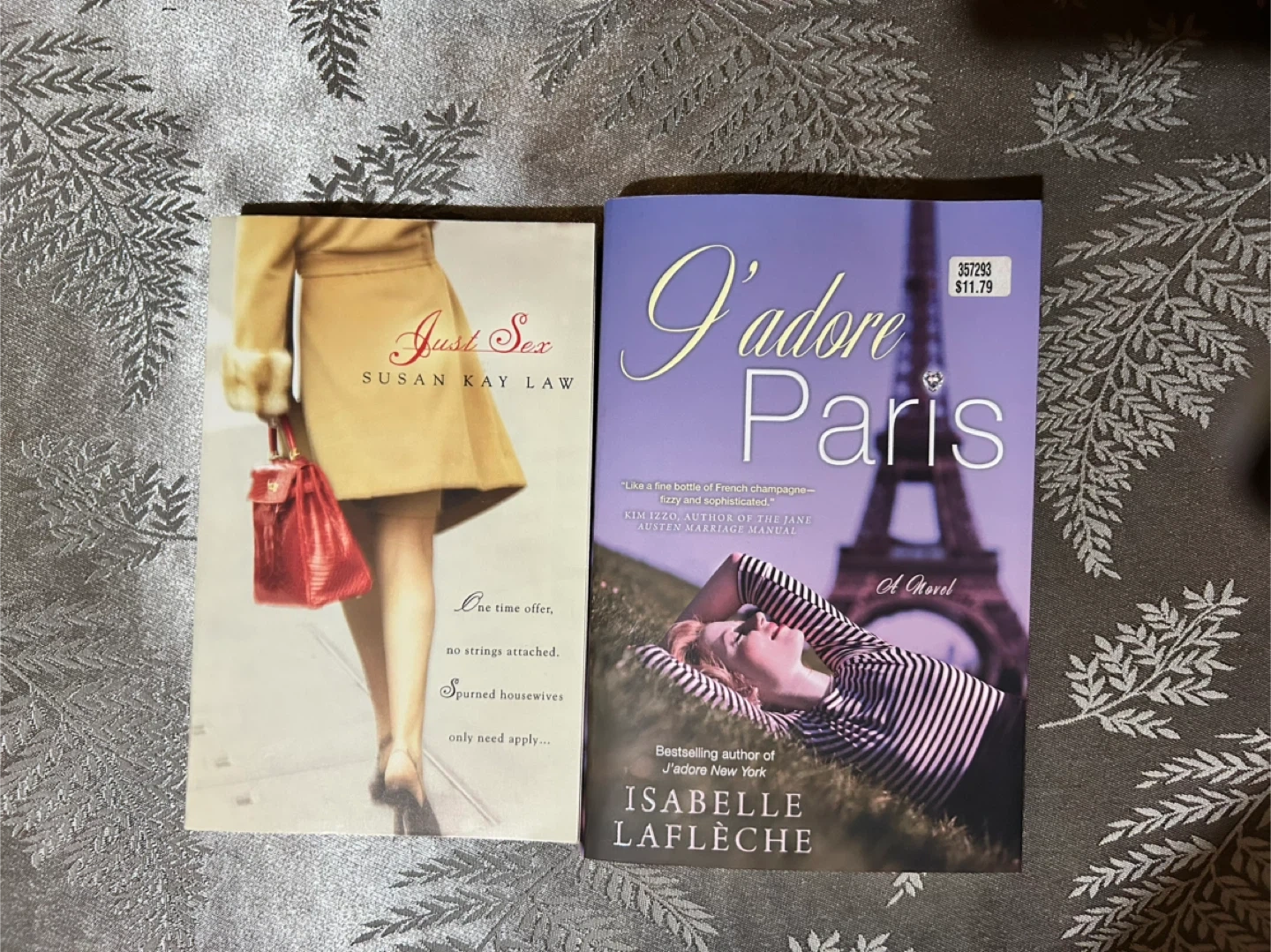 Selling two novels together! One is 'Just Sex' by Susan Kay Law, and the other is 'J'adore Paris' by Isabelle Lafleche. 'J'adore Paris' originally had a sticker price of $11.79. Selling $5 each book