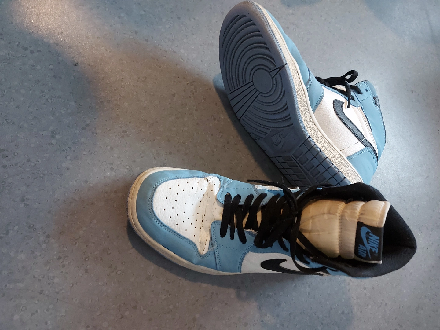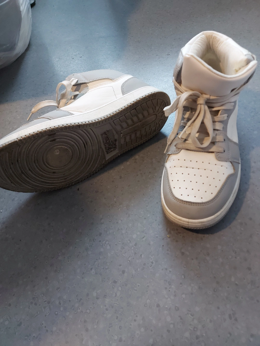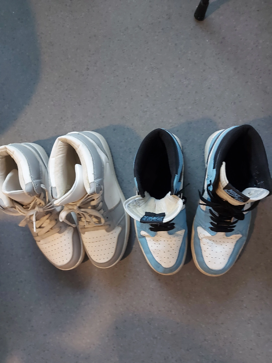 *ONE-PAIR OF NIKE-AIR JORDANS * COLOUR-BLUE, WHITE & BLACK *SIZE-10 *GOOD CONDITION *ASKING $35 *SECOND-PAIR HAS NO BRAND ANYWHERE ON THEM * COLOUR- GREY & WHITE *SIZE-9 *GREAT CONDITION *ASKING $20
