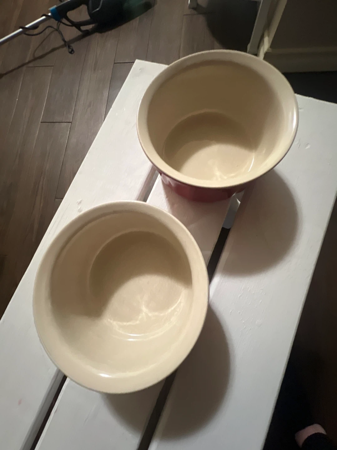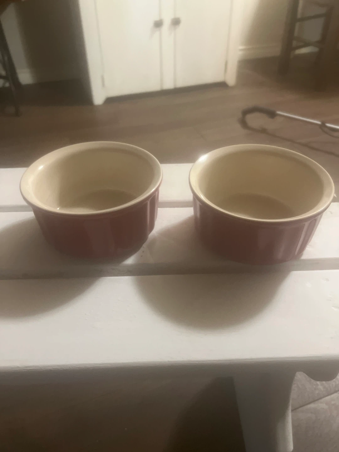 Selling two ramekins, perfect for baking individual desserts or serving dips! They are in great condition and ready for a new home. The ramekins have a red exterior and a cream-colored interior. Light scratching on the inside. No chips.