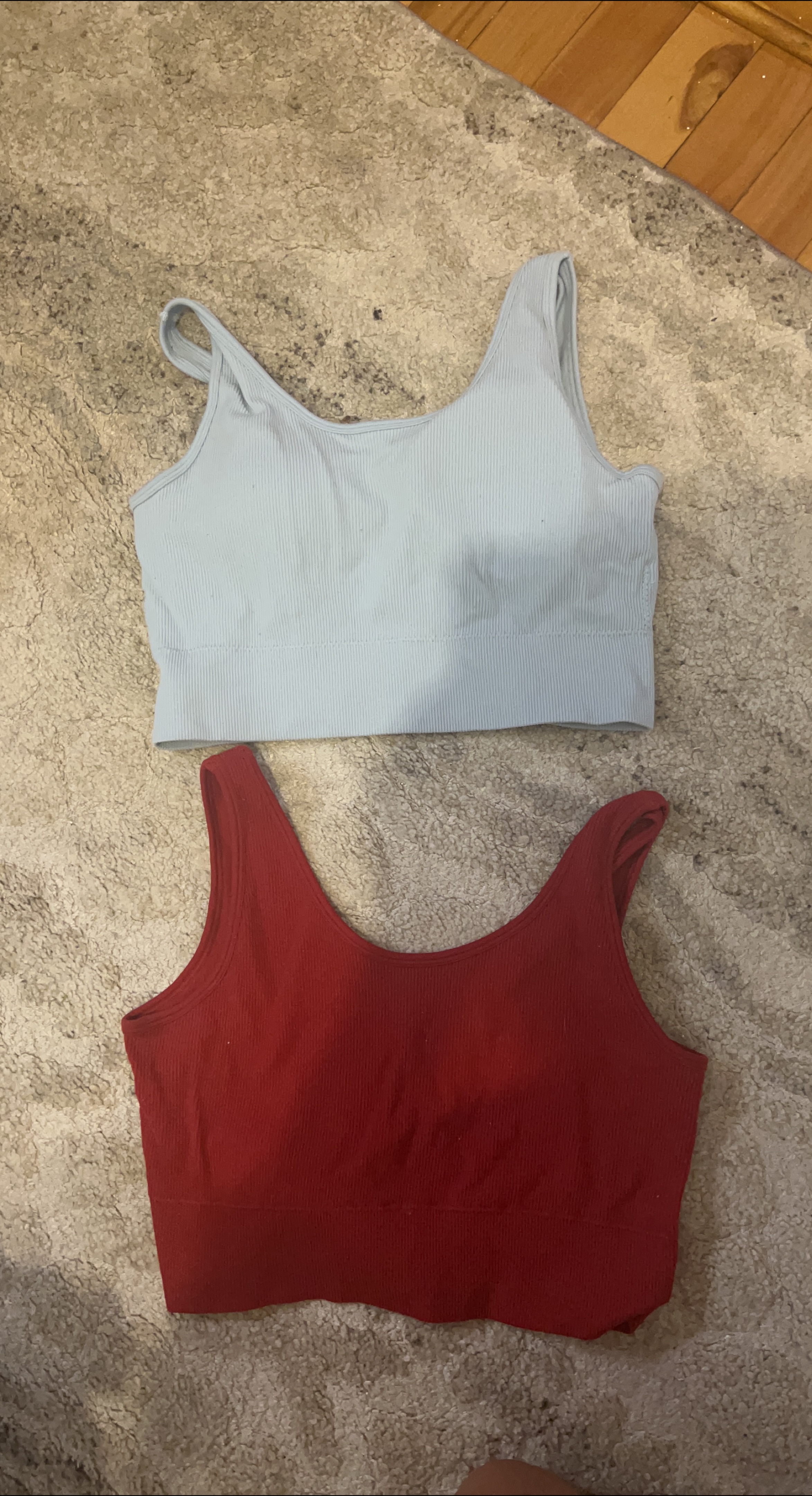 Selling two ribbed tank tops! One is a light blue colour and the other is red. Both are in great condition and ready for a new home
