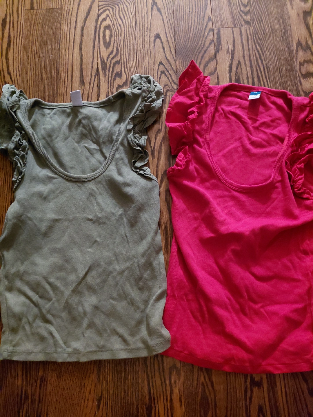 Selling two cute ruffle tank tops! One is a nice olive green, and the other is a vibrant pink. They're both in great shape and ready for a new home size is petit and extra small