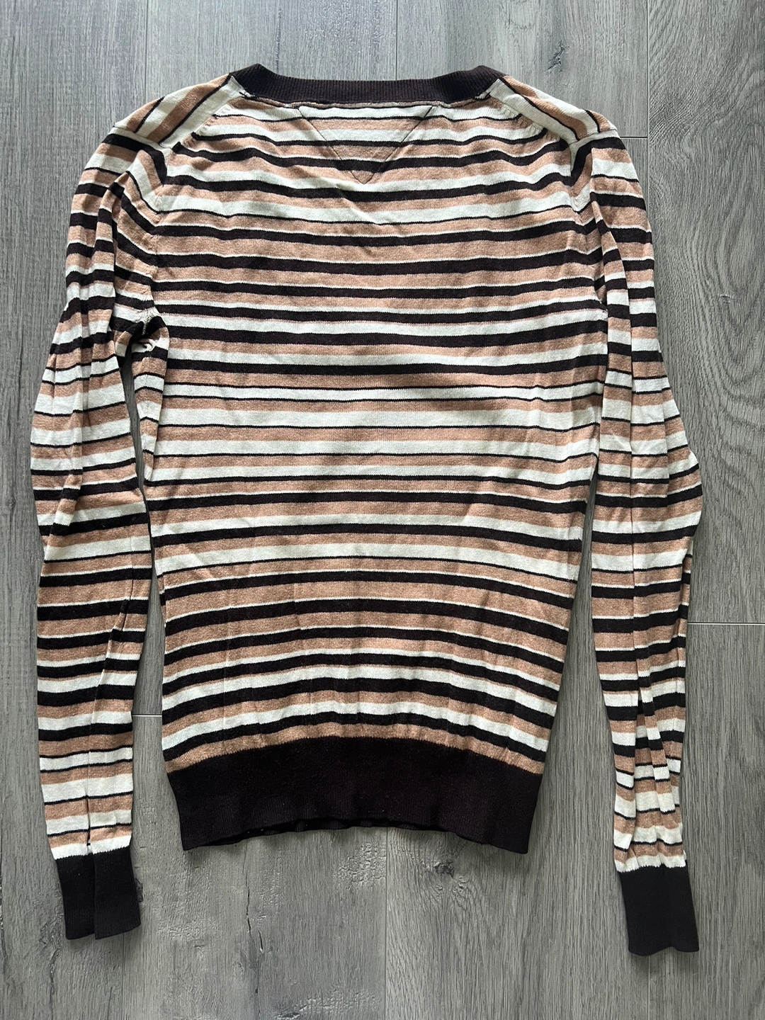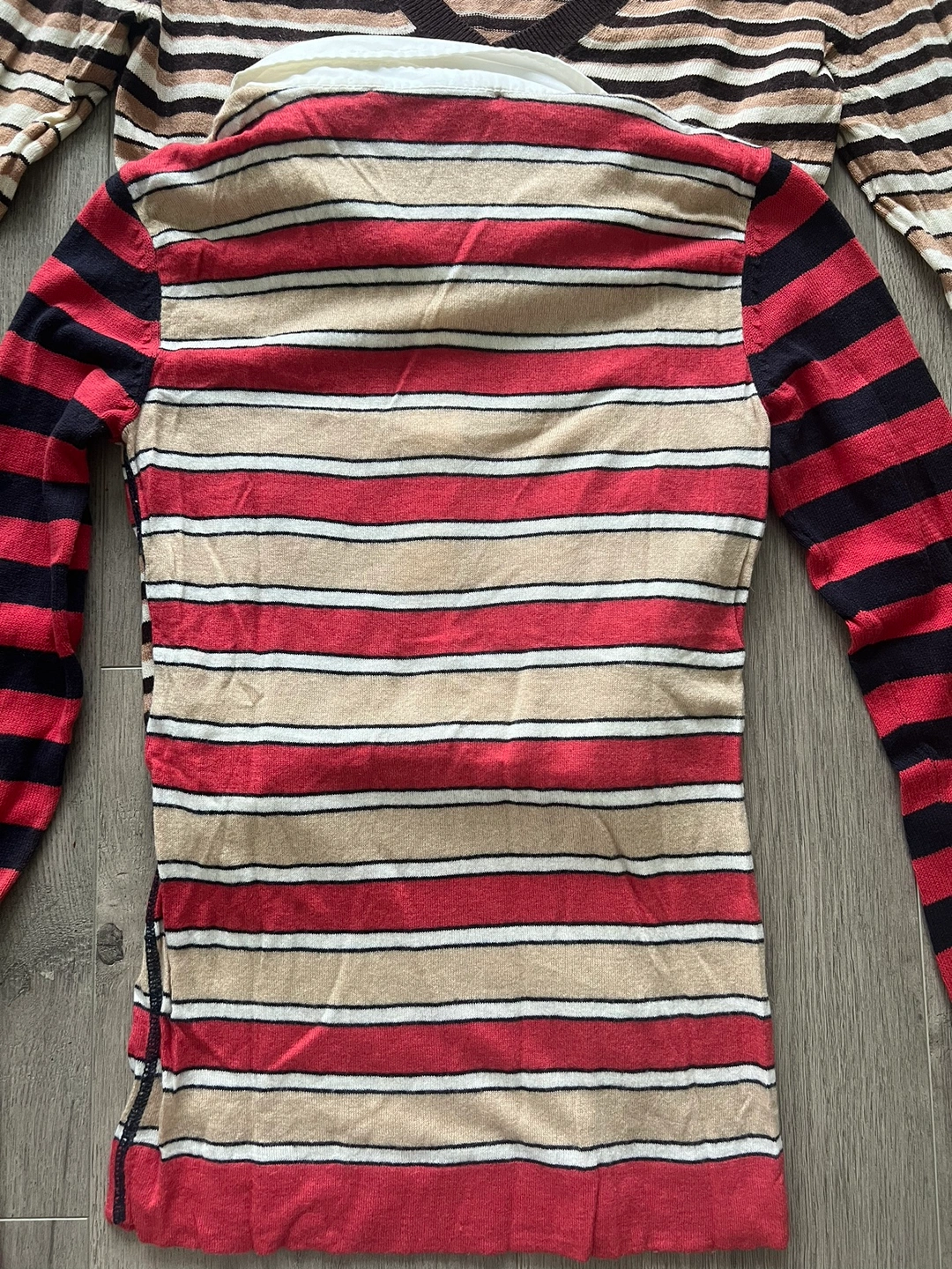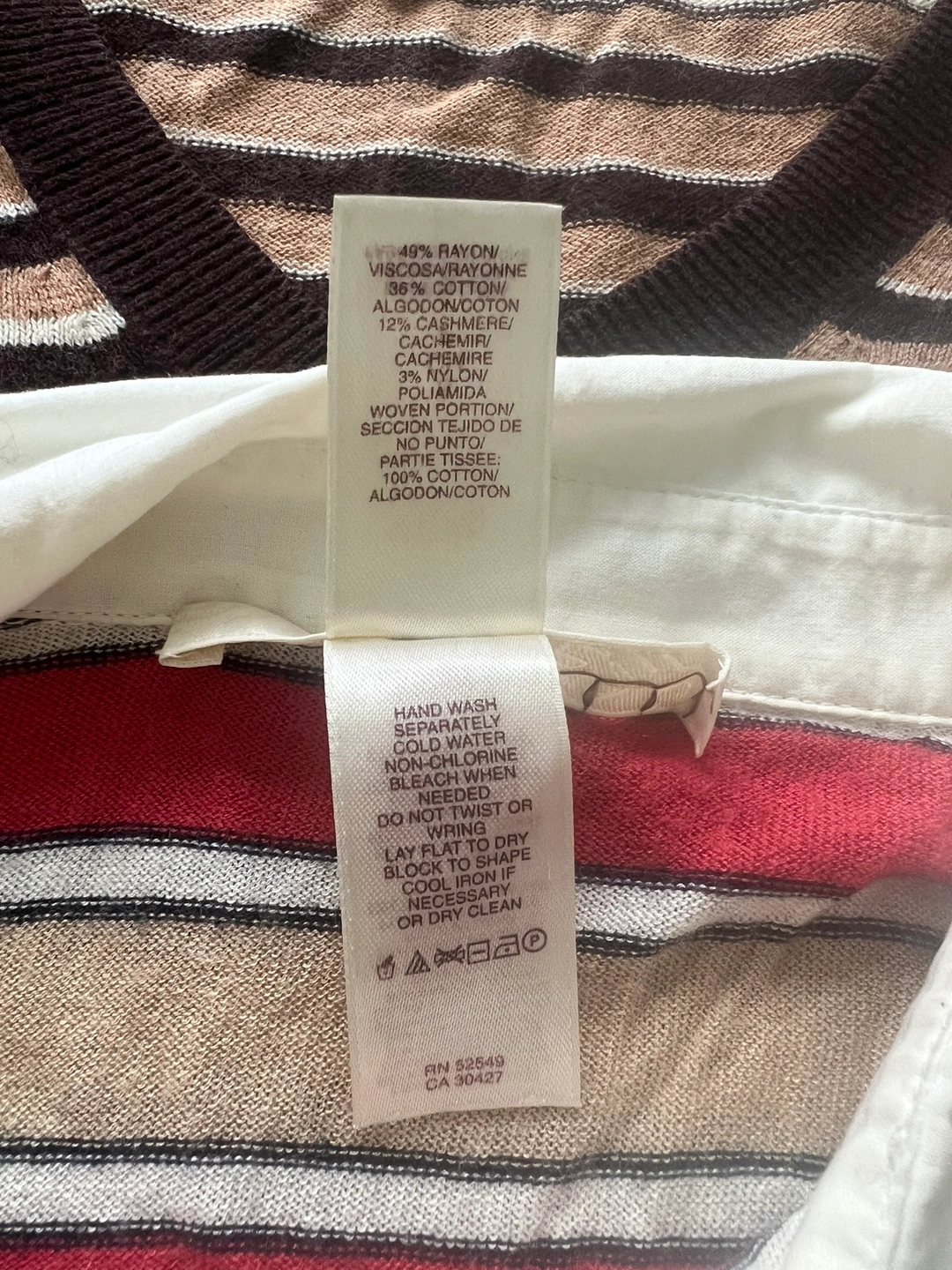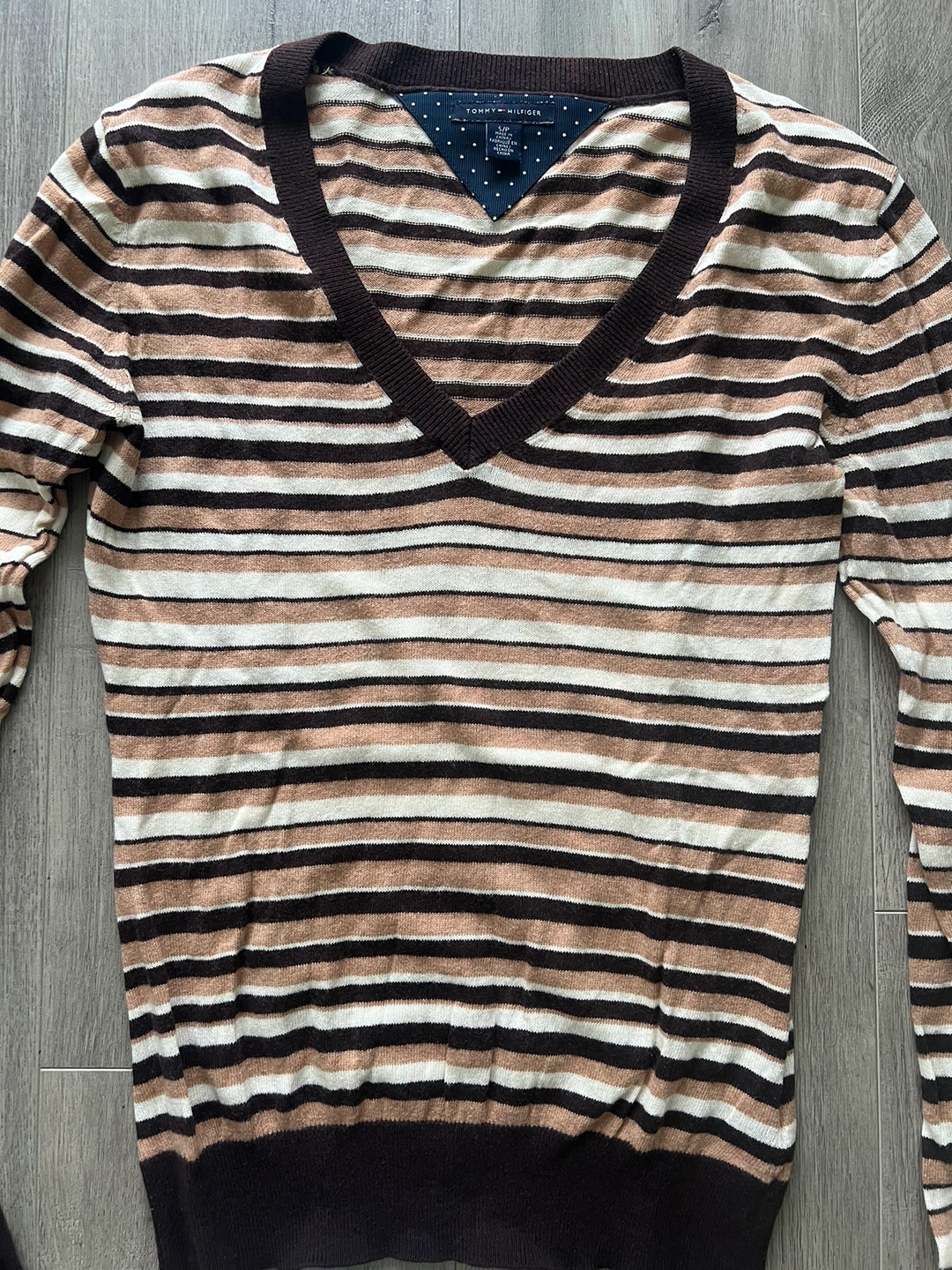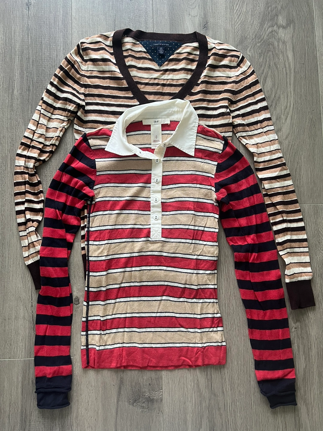 Two long sleeve striped shirts. One is a V-neck sweater with brown, tan, and white stripes by Tommy Hilfiger. The other is a polo shirt with a white collar, white buttons, and black, tan, and red stripes by lbd. With cashmere!