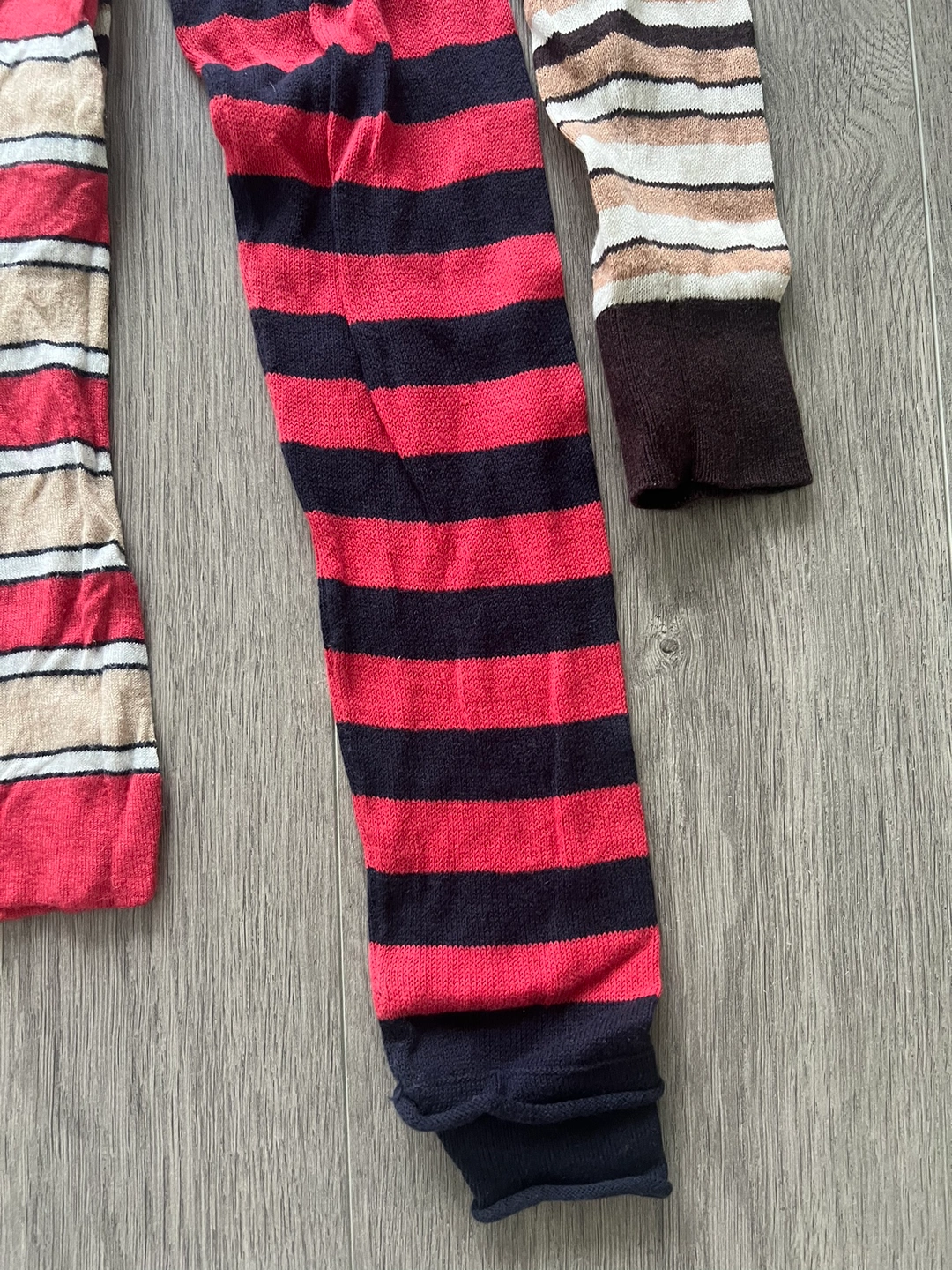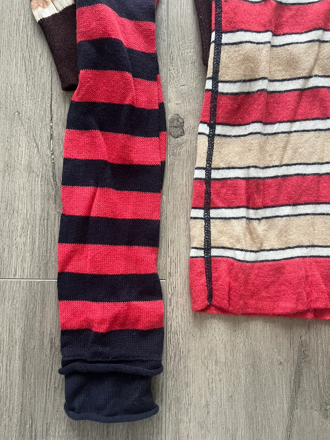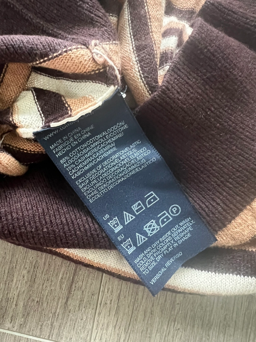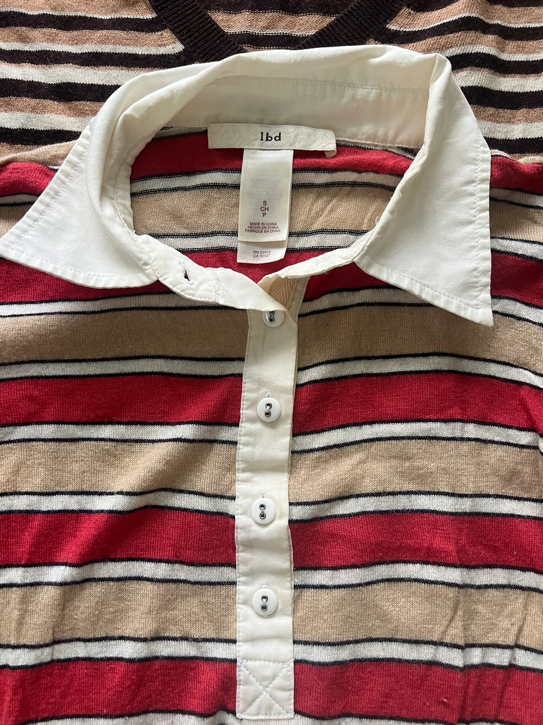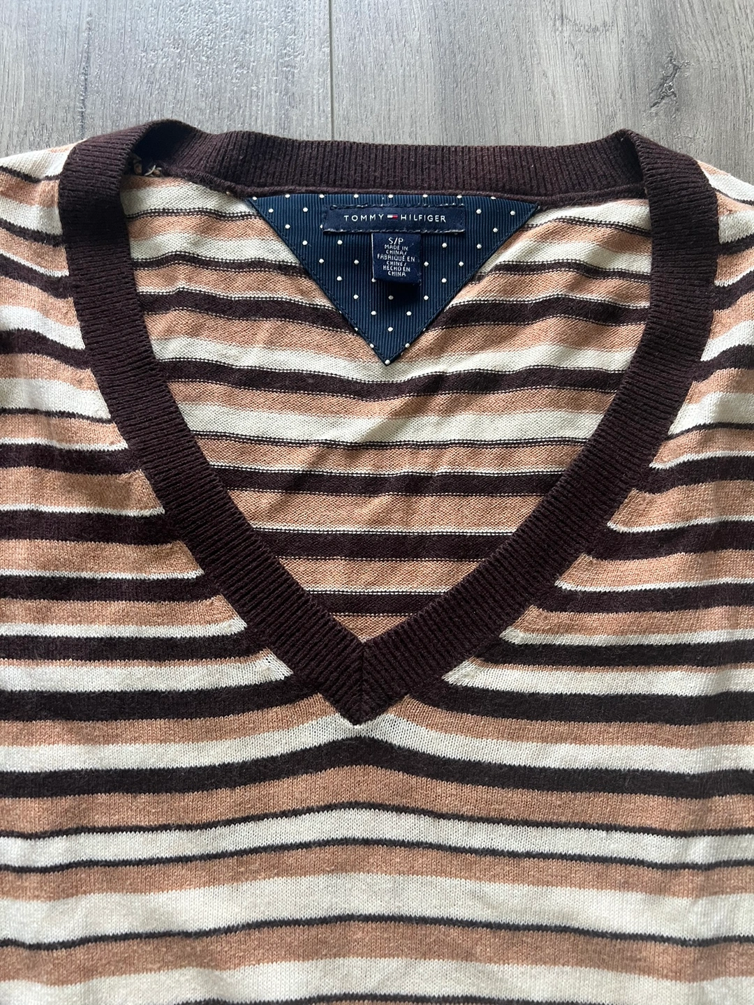 Two long sleeve striped shirts. One is a V-neck sweater with brown, tan, and white stripes by Tommy Hilfiger. The other is a polo shirt with a white collar, white buttons, and black, tan, and red stripes by lbd. With cashmere!