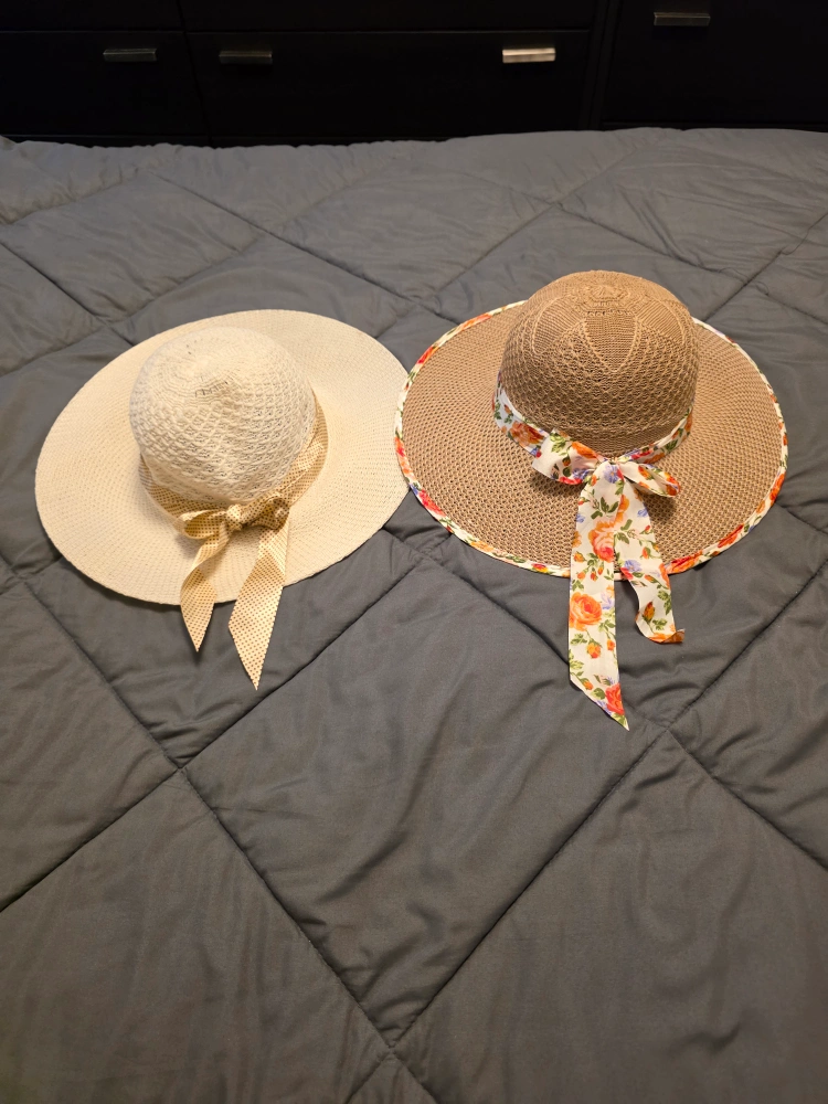 Two sun hats for sale! One is a light beige colour with a ribbon, and the other is brown with a floral ribbon. Perfect for sunny days out and about!