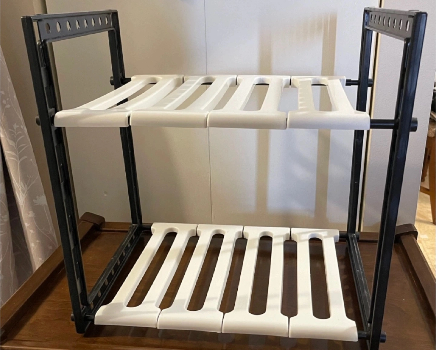 Two-tier shelf organizer. Black plastic frame. White plastic shelves. Perfect for kitchen counter, bathroom counter, pantry, cupboard, closet, or over the microwave. From smoke-free, pest-free, and pet-free home. Rarely used. Excellent condition. Cash and pick up only. **Feel free to check my other listings** **Important Notes** 1) The Karrot platform operates on a "final sale" basis, meaning buyers are responsible for their purchases. No returns, and no refund once the purchase is finalized. 2) Buyers are encouraged to carefully check the item descriptions and dimensions before contacting the seller to show their interest. 3) Buyers are advised to inspect any item before finalizing the purchase.
