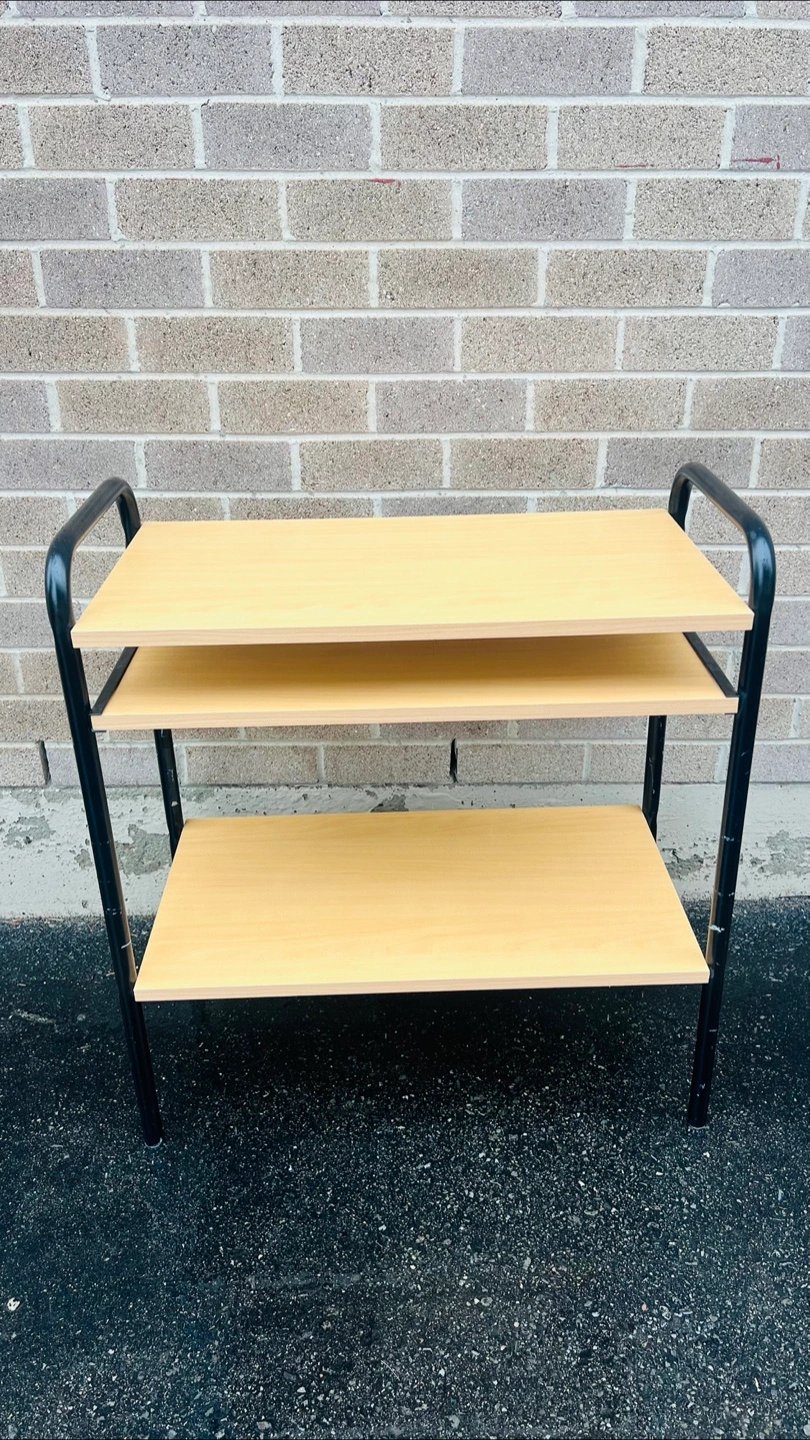 Two-tier serving cart. Features a light coloured wood top and shelf. Black metal frame and legs. Small size, perfect for small spaces. Easily can used for laptop and PC with keyboard slider.
