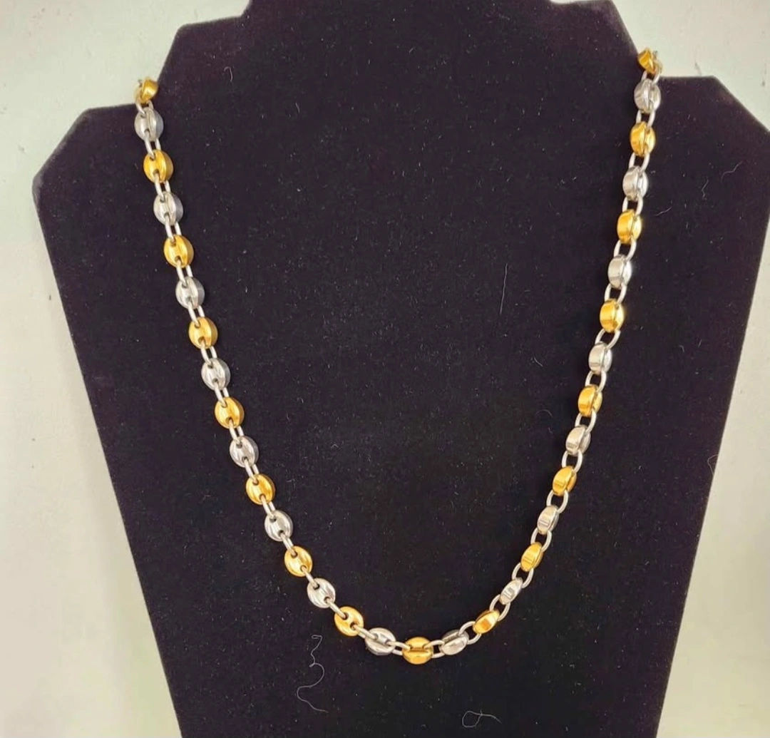 Selling a stylish two-tone necklace featuring alternating gold and silver links. It's in great condition and adds a touch of elegance to any outfit!